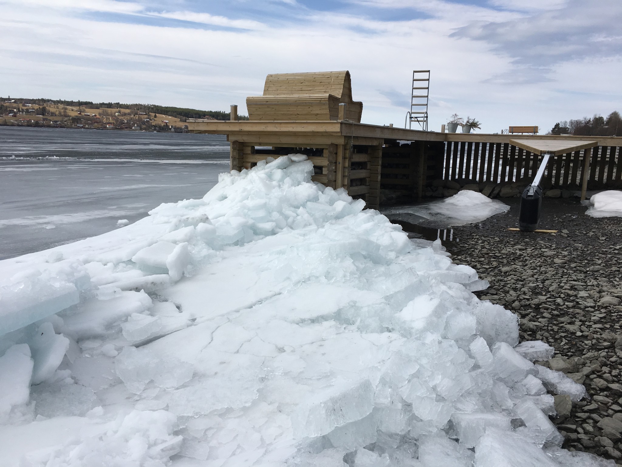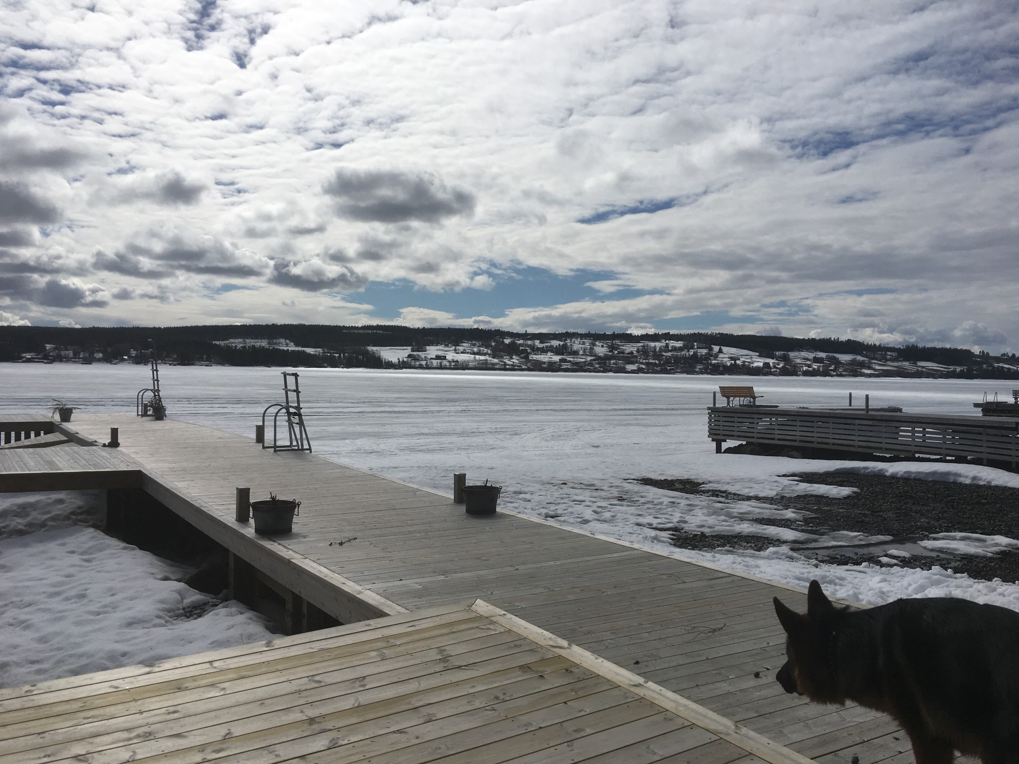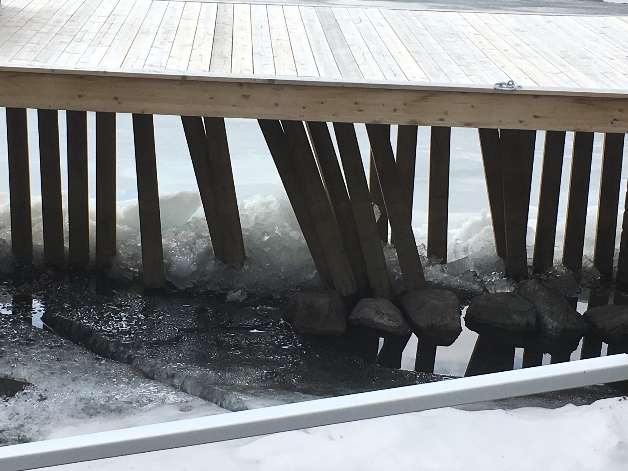 Inatt har det hänt lite grand. I vanliga fall har isen redan hunnit försvinna innan vattnet nåt bryggan men i år har isen legat längre och sjön stigit fortare än vanligt. Detta har hänt under natten.