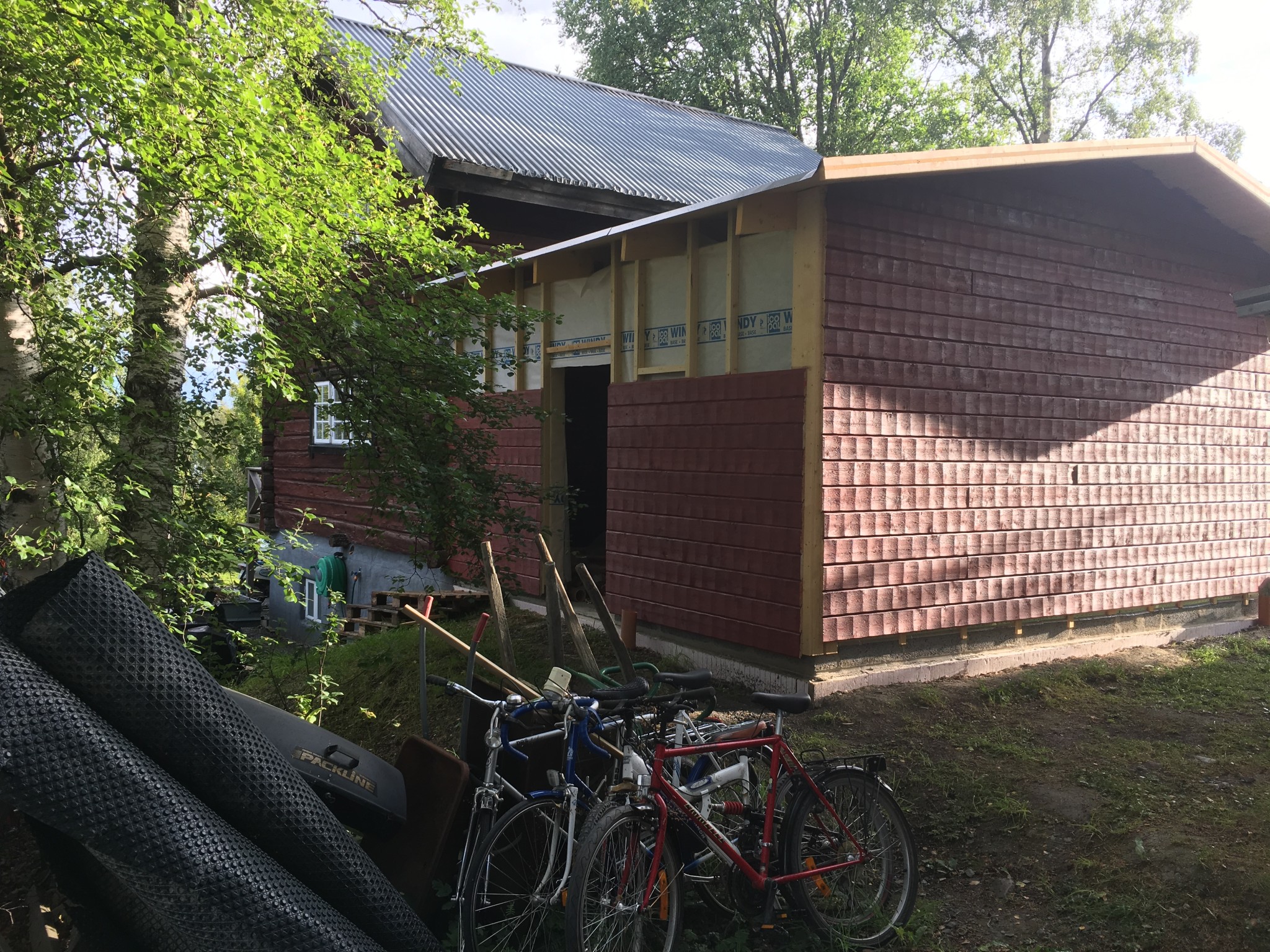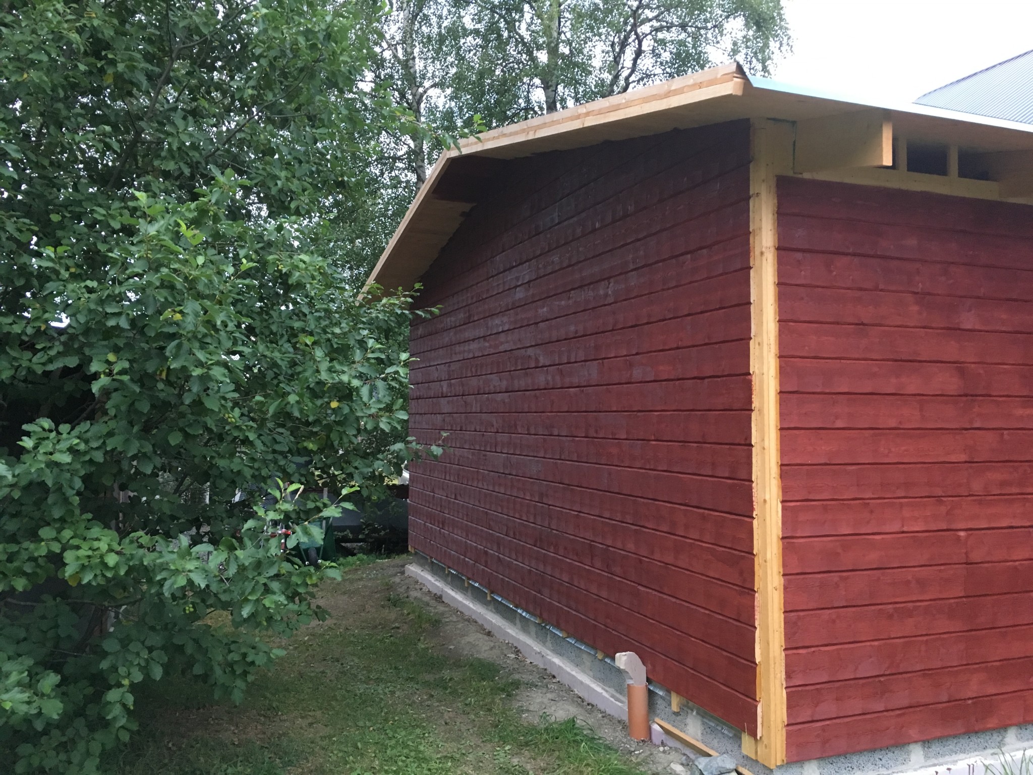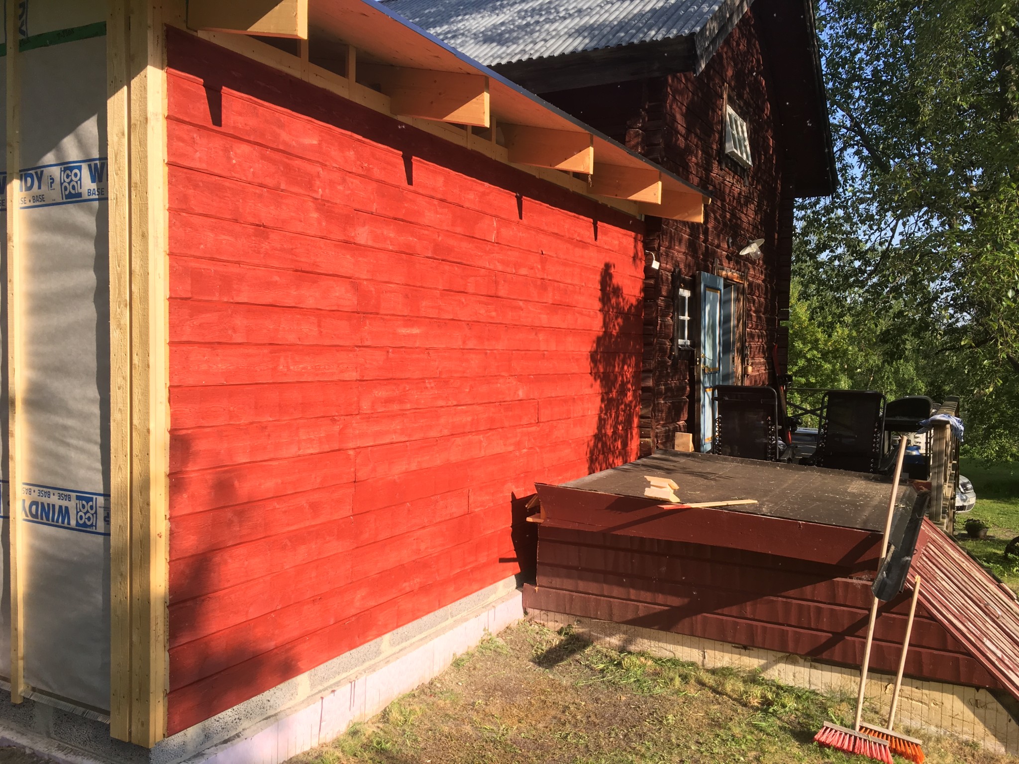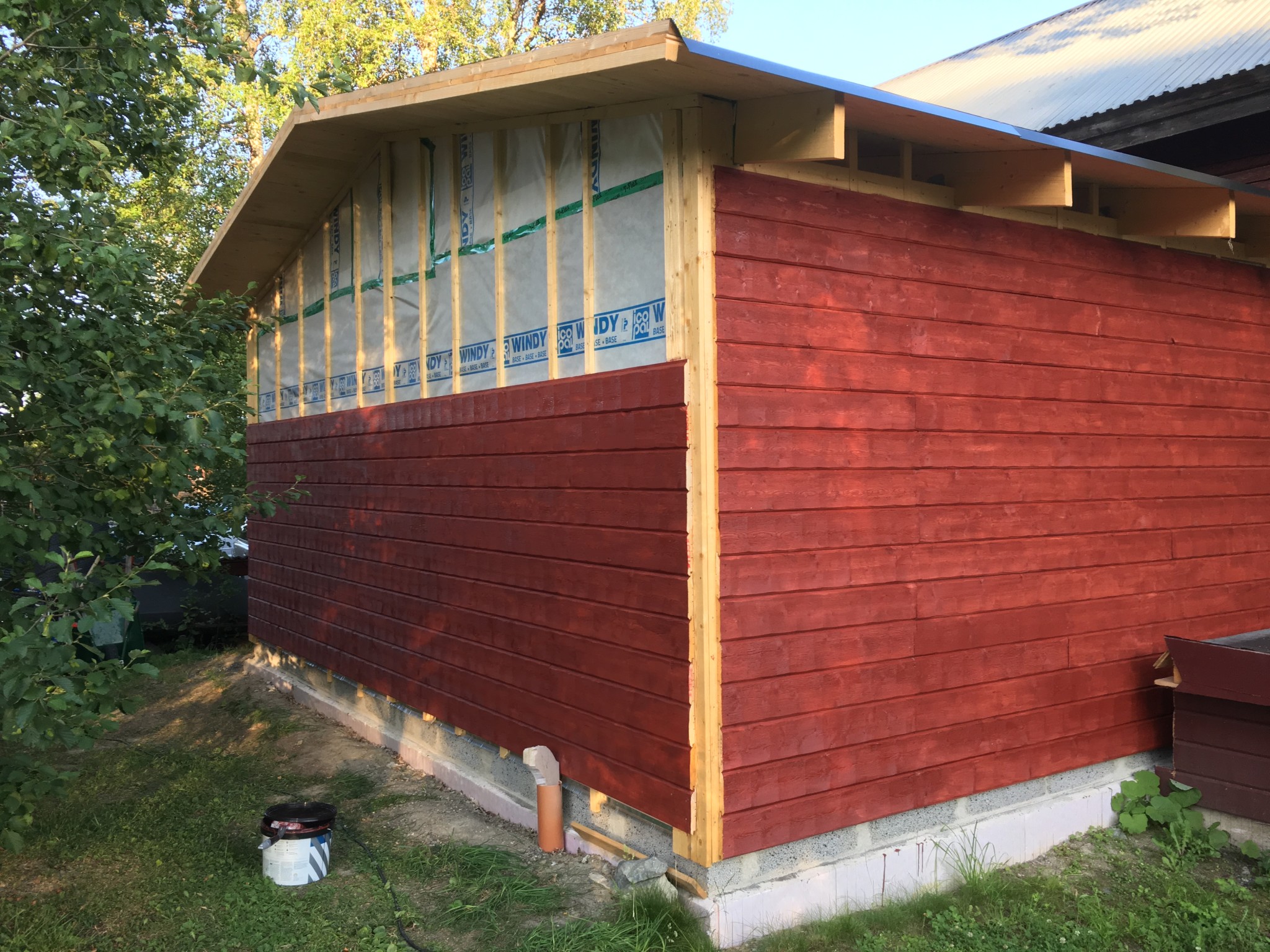 Första sidan närmar sig. Måste bara fixa vindpappen uppe vid takfoten innan första väggen är klar. Samt panela sista 25 centimetrarna.På denna vägg ska det upp 2 fönster så småningom för tillfället igensatta ( det är reglat för dem innanför)