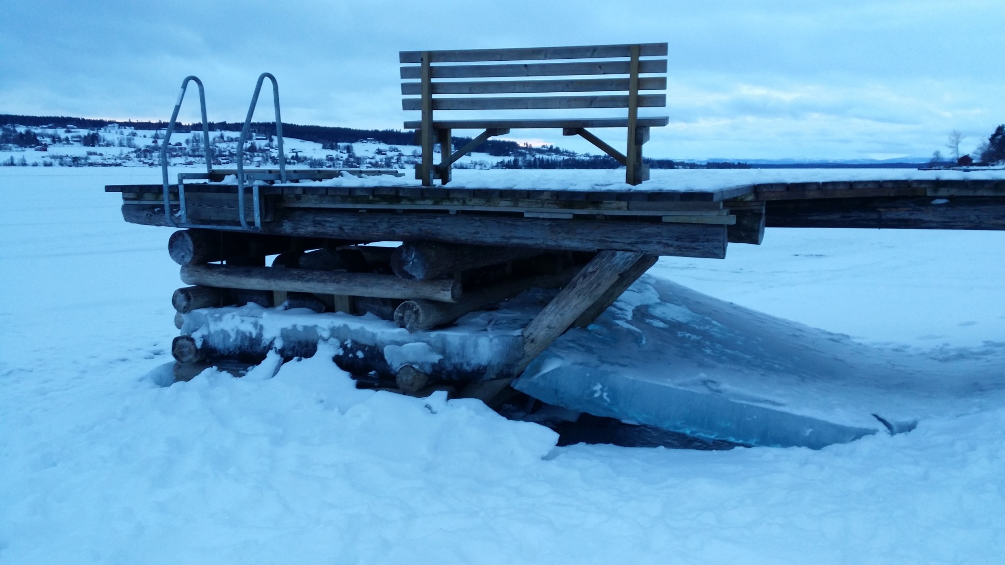 Om den inte varit klädd hade jag haft problem nu tror jag, för vattnet har stigit men isen följer med upp längs bryggan