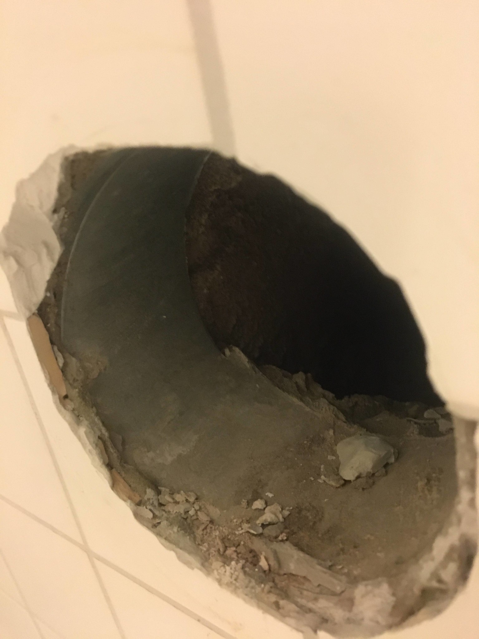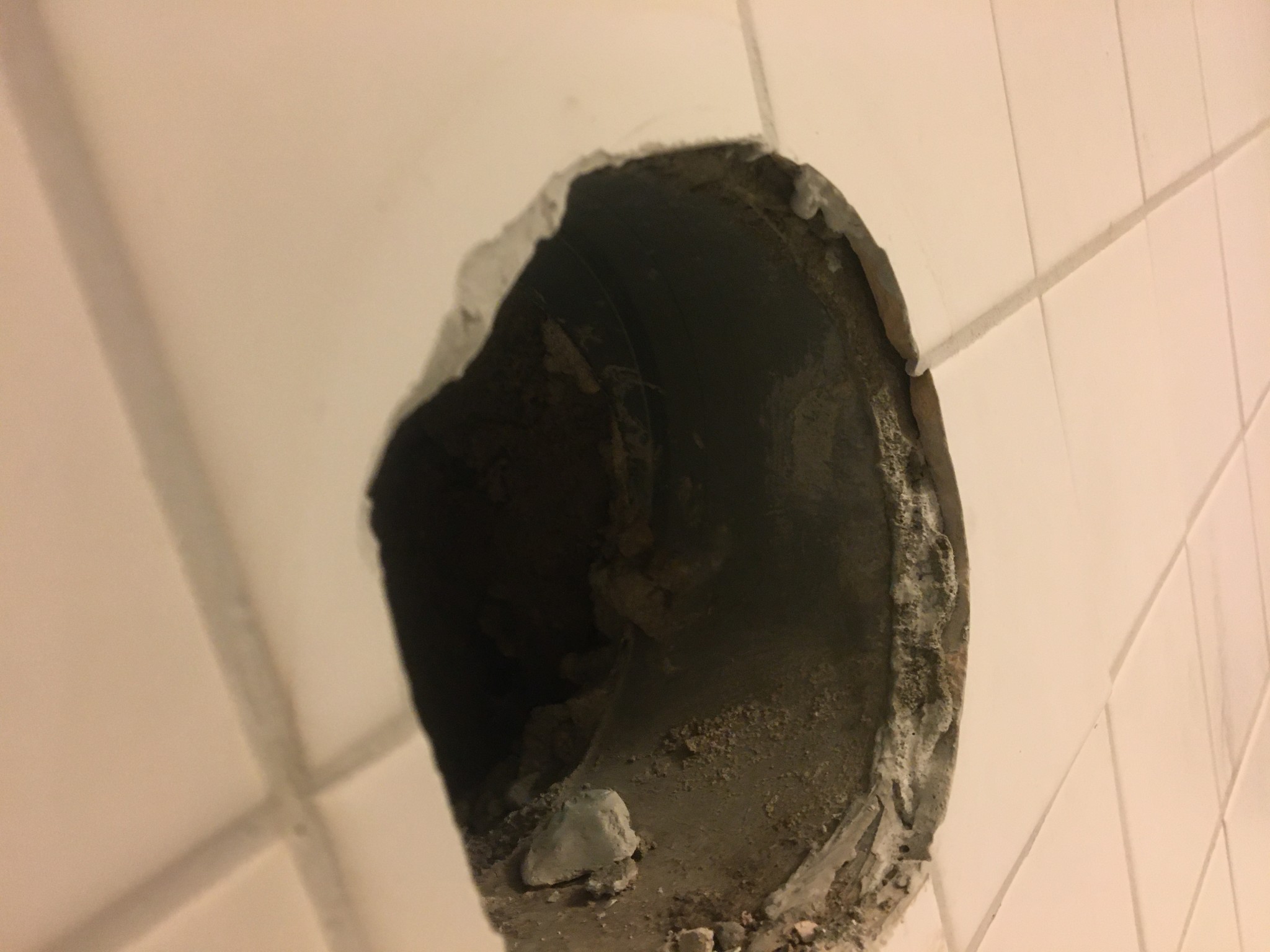 Hantverkare har renoverat mitt badrum. Nu när jag tar loss tillufts-donet och tittar in en genomföringen så ser det... lite konstigt ut?