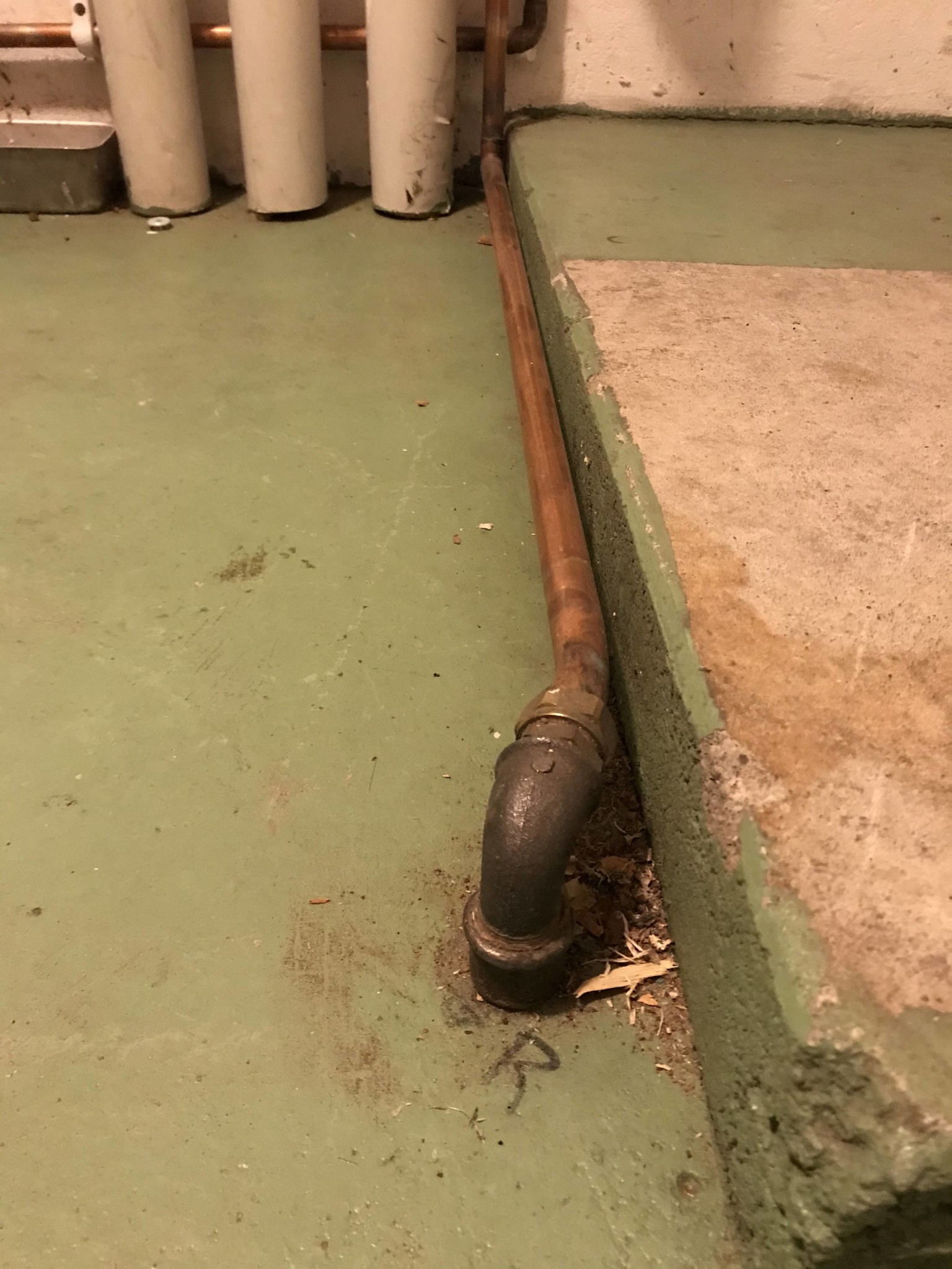 Upp ur golvet i källarplan kommer en kopparledning märkt R, antar att det är en retur.