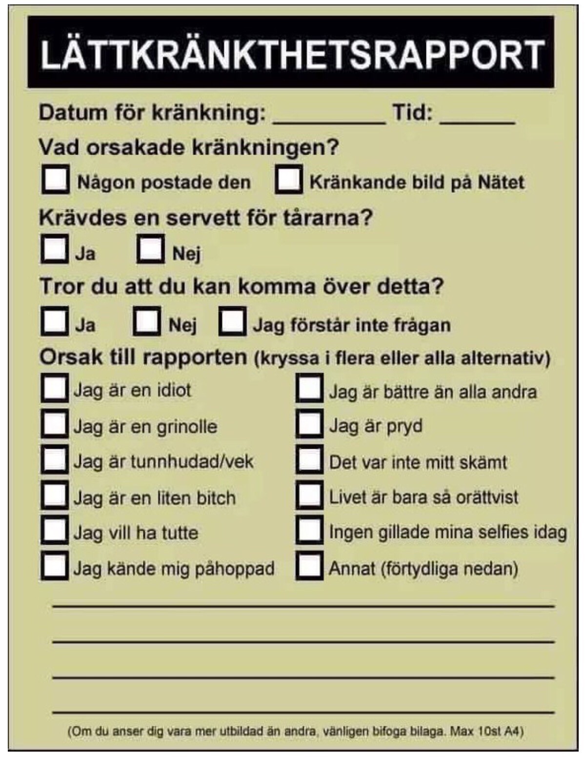 Humor är bra när den sparkar uppåt men inte neråt. Det är därför skämt om t.ex. fysiskt eller psykiskt handikappade och barn fungerar dåligt.B b8q skrev:Svårare än man tror - det finns ALLTID någon som kan känna sig kränkt, själv eller å andra vägnar ("kränkt by proxy").