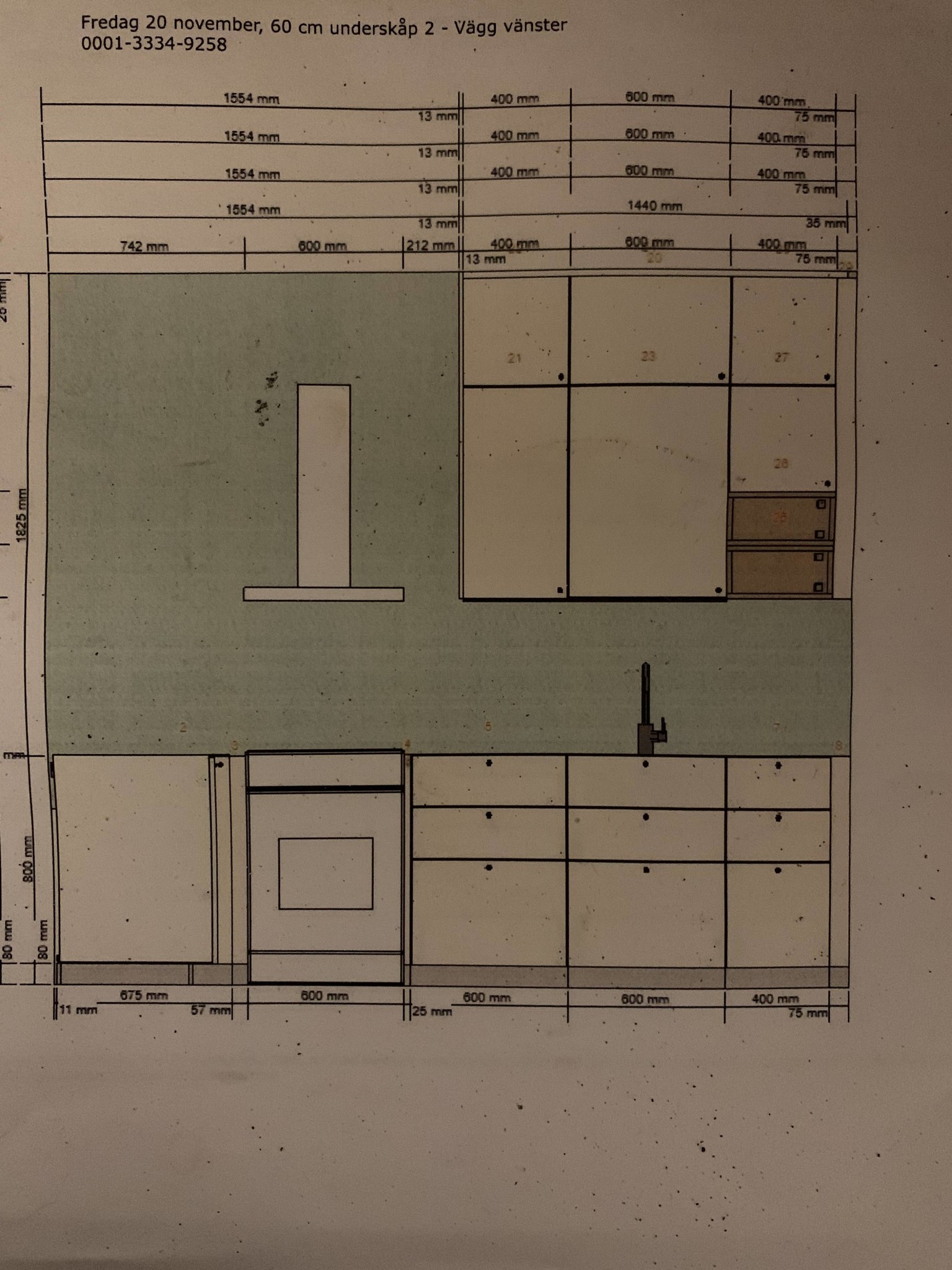 Har också nu en slutgiltig ritning. Skåp kommer sticka ut 37 cm från väggen till vänster. Syns inte på ritningen. Hade egentligen tänkt måla väggen bakom fläkten.och bara ha vitt kakel en bit upp. Är rädd att det blir för rörigt eller för mycket vitt. Väggfärg vald Jotuns Lövsal, en lite grågrön färg men ändå lite mer grön.
