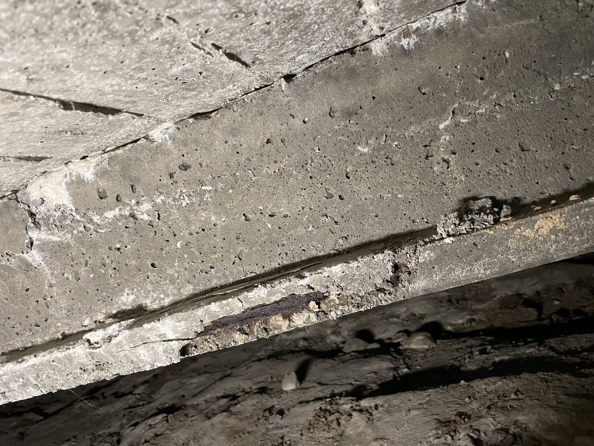 Upptäckte vid inspektion att vår krypgrund har fått en skada på en av de prefabricerade betongbalkarna, armeringen har rostat och sprängt sönder betongen.