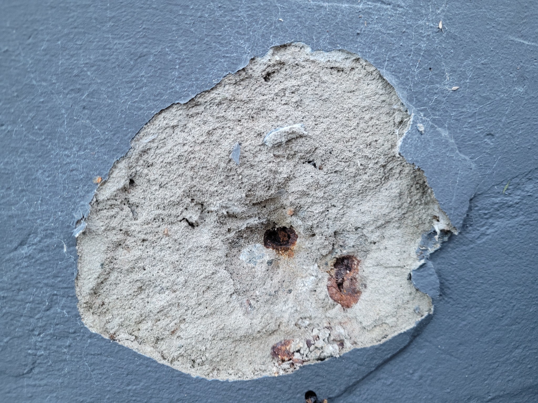Mitt i fläcken är en skada i putsen (visst är det puts?) på husgrunden. Den är ca 15 cm-20 i diameter så alltså relativt liten men det ser ut som att det i mitten sticker ut lite sönderrostad metall (armeringsjärn?). Se bild.