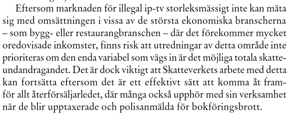 Det utredaren säger är att Skatteverket ska prioritera IP-TV framför svartarbete inom bygg och resturangbransherna.A AndersS skrev: