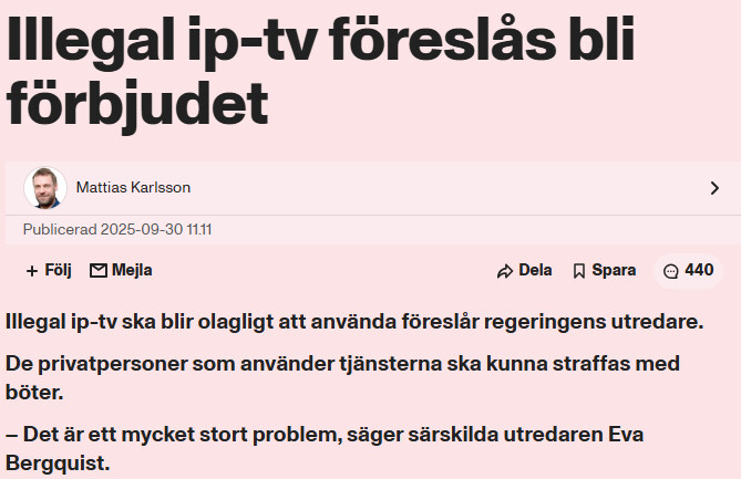 IP-TV är redan olagligt idag, Lagförslaget är ju att polisen ska prioritera visa copyrights brott framför andra copyrights brott utifrån lyckat lobbyverksamhet.asdf123 skrev: