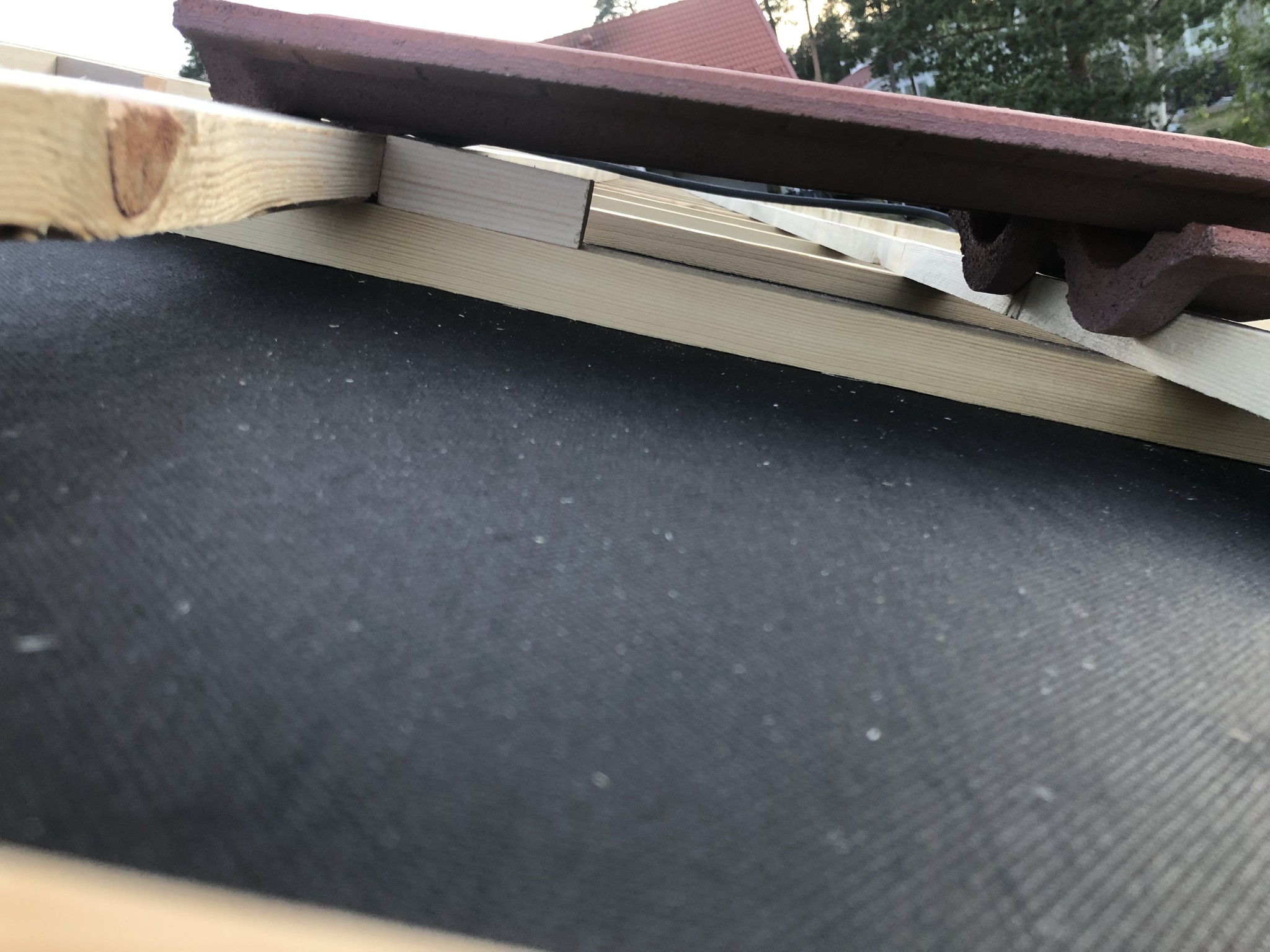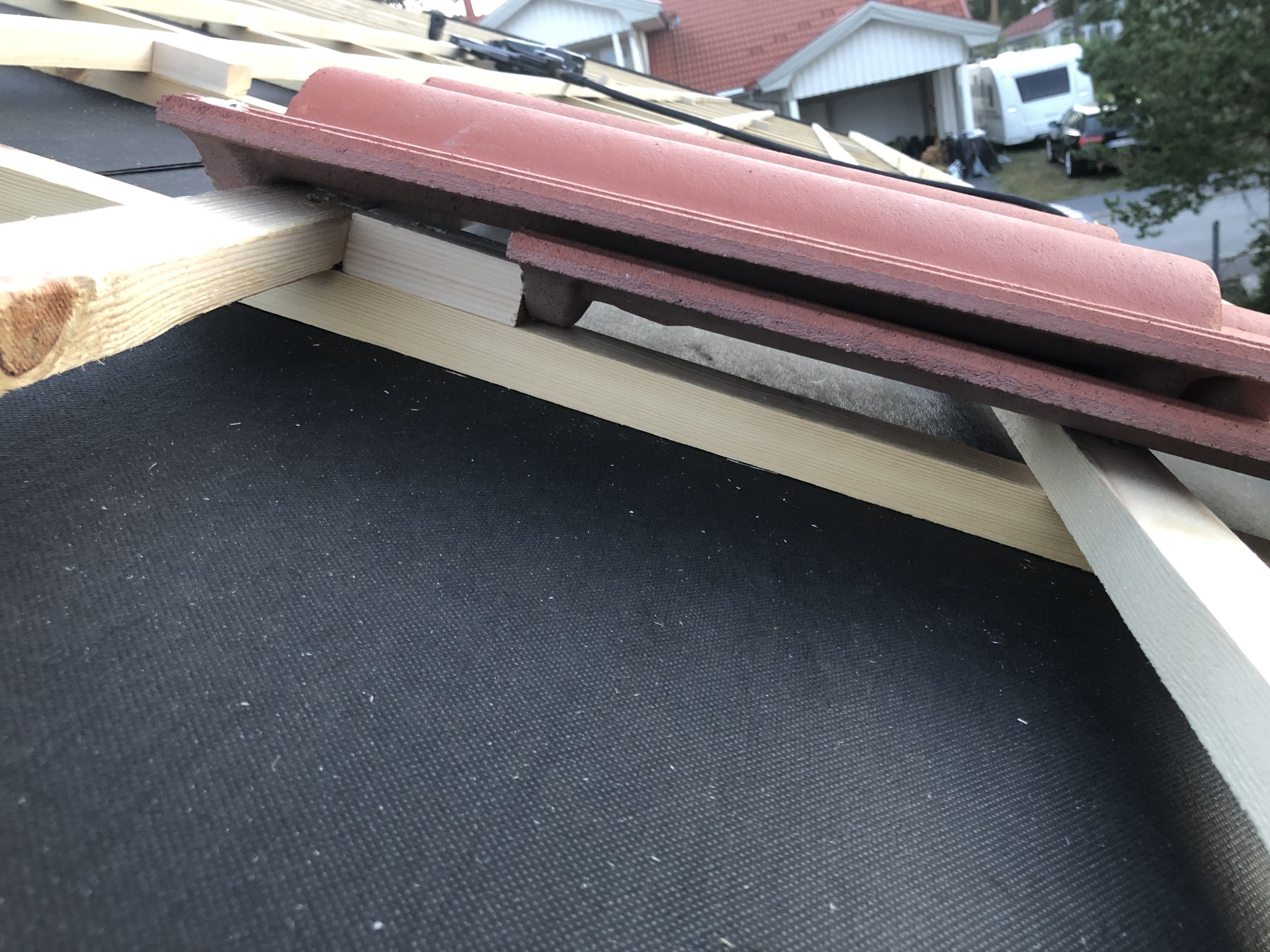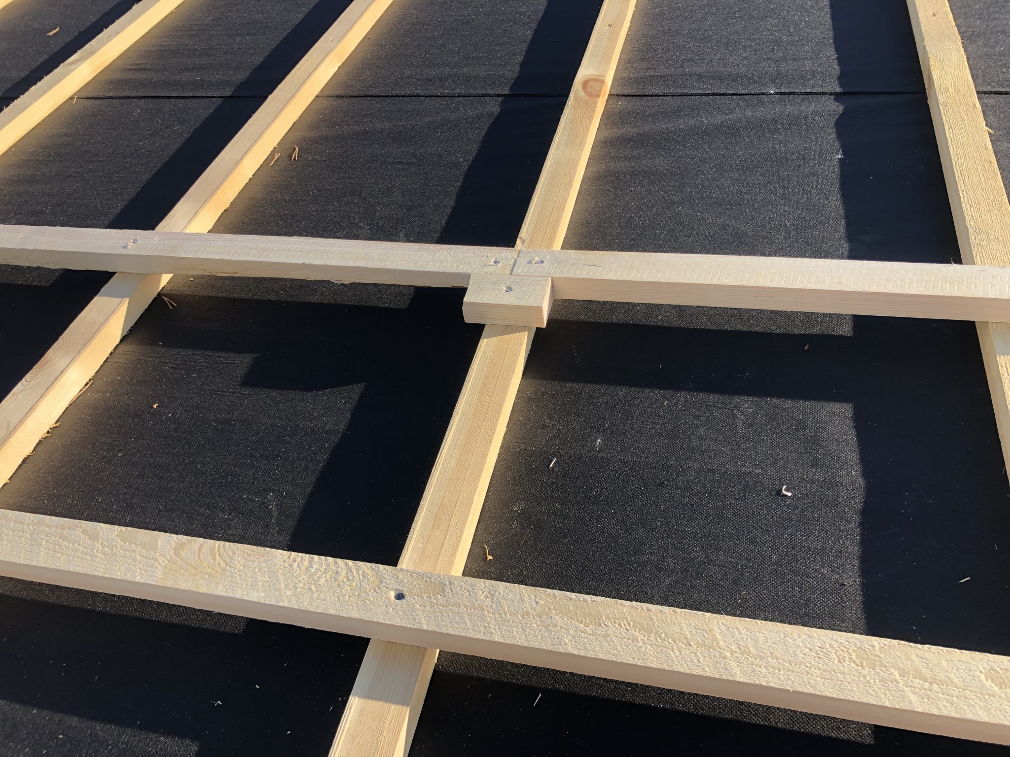 Jag har börjat lägga bärläkt på garagetaket och ser till att skarva över ströläkten. Jag tyckte dock att det vore bra med stödklossar direkt under skarven se bild.