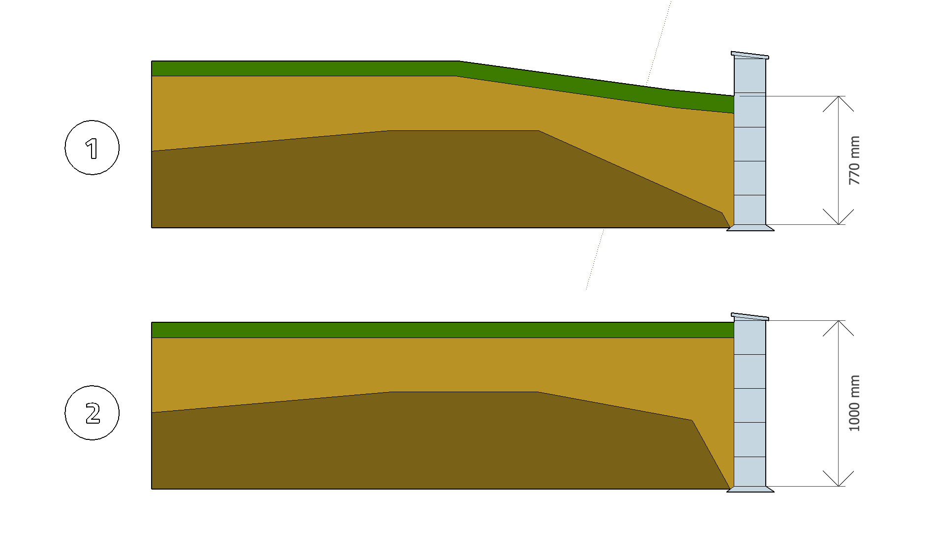 Exempel: Vid "planmark" så möter marken muren vid 80% av murens totalhöjd, och vid "lutande mark" så möter den muren vid 60% av murens totalhöjd.