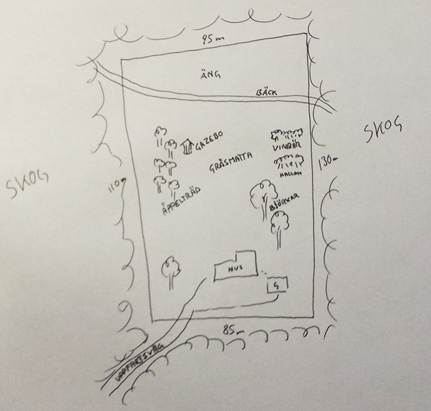 Nej, huset står vid ena kortsidan av tomten så det är bra mycket mer trädgård på ena sidan än den andra. Jag har försökt att stega längs skogskanten så måtten är hyfsat ungefärliga. Tomten är omgärdad av träd på alla sidor men det är väl den enda tydliga gränsen. Det mesta är gräsmatta men på andra sidan av en liten bäck så är det mer som ängsmark. Jag har funderat på att göra gräsmatta där med och använda bäcken med en liten spång över, som ett naturligt smycke däri.Nötegårdsgubben skrev: