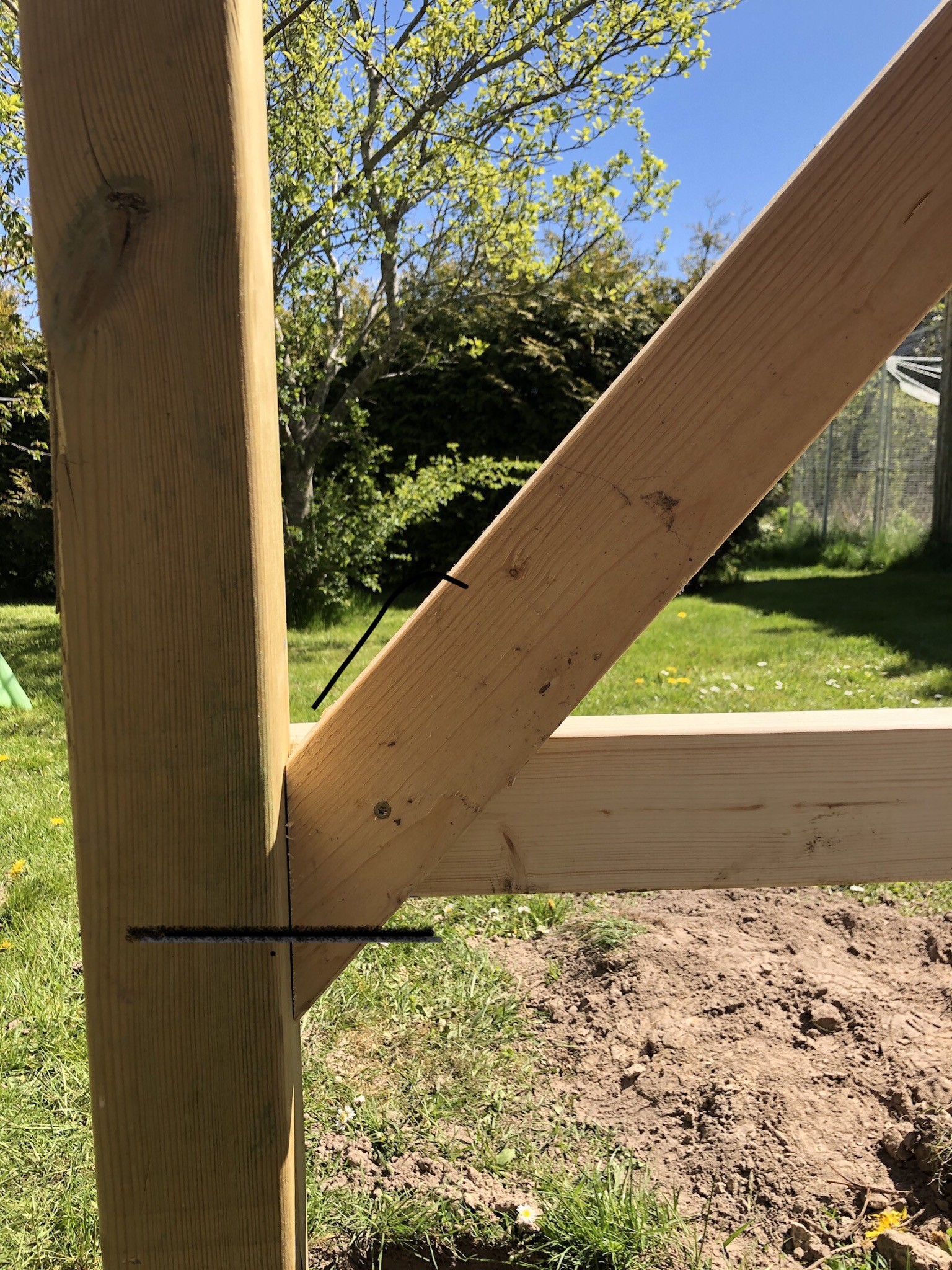 Bygger förråd och satt några snedsträvor. Räcker det att dessa skruvas i de horisontella reglarna eller ska jag dra en skruv in i stolpen som markerat på bild 1?