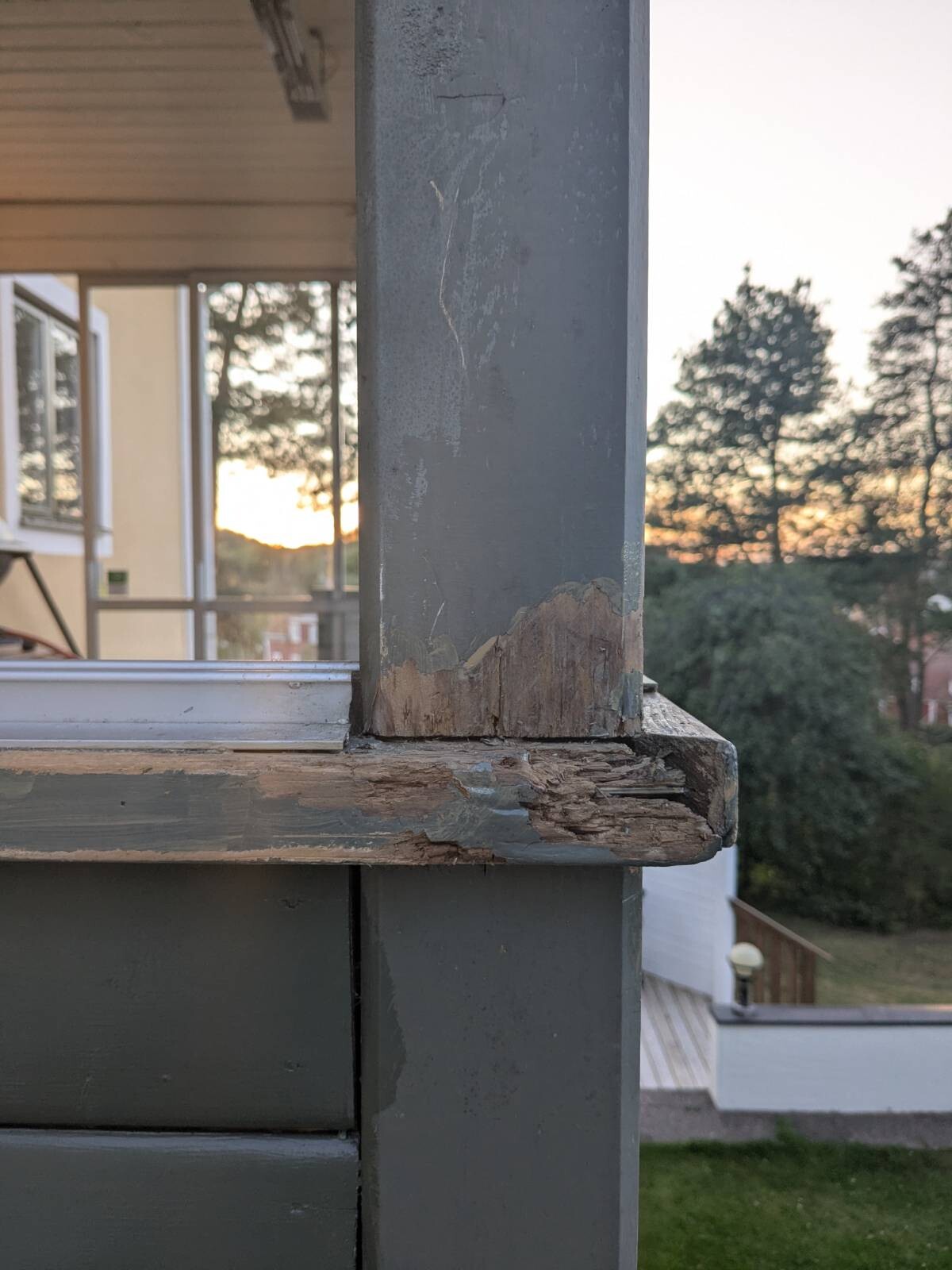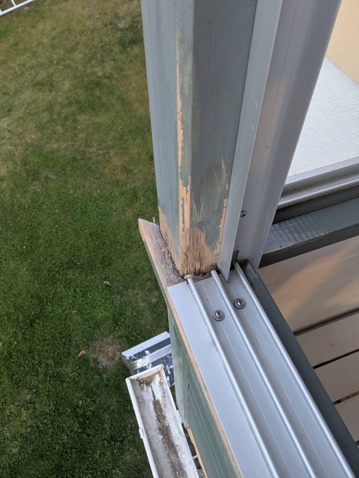 Nu till frågan. Problemet runt stolpen kommer antagligen komma tillbaka om jag inte förändrar något. Min första tanke var att hyvla de liggande plankorna så att det blir ett fall. Funderade även på om det skulle vara snyggt att fästa en plåt runt stolpen, aluminiumspåren för fönstrena ställer dock till det lite.