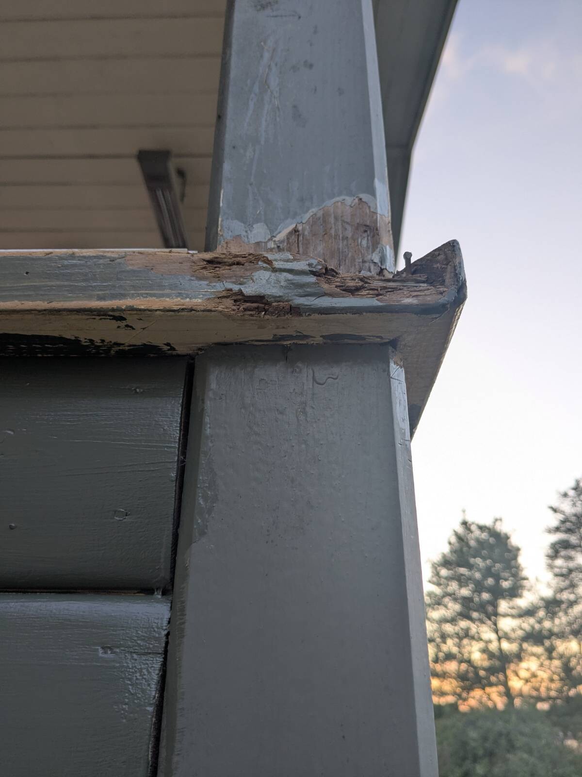 Jag har börjat försöka fixa till några skador på balkongen, stolpen på bilderna är först ut. Stolpen går upp till tak och jag vill helst undvika att byta ut den helt då jag behöver prioritera bland projekten just nu. Stolpen känns stabil och kniven går in knappt 5mm på det värsta stället. Jag tänkte såga bort skadat trä och kila in nytt, eventuell skarv kan jag leva med.