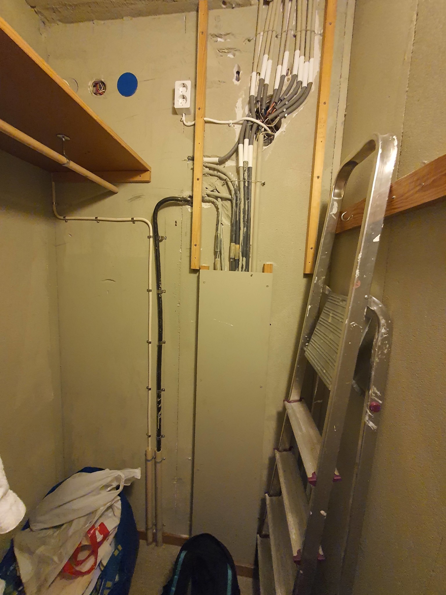 Vi ska slå ihop en liten toa med ett förråd och bygga ett badrum. I förrådet fanns tidigare en elcentral, men den är nu flyttad till andra sidan väggen. Kvar är dock en bunt inkommande rör och kablar.
