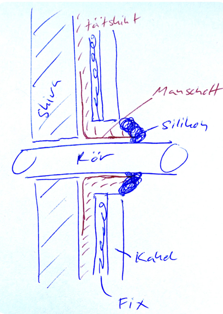 Och när jag nu ska placera duschen direkt vid genomförningen vill jag bara försäkra mig lite extra att det åtminstone inte kommer vatten direkt på dem när jag duschar. Och täcka dem på något annat sätt än att ha duschdraperivägg eller glasvägg.