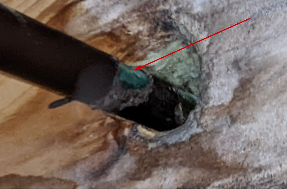 2) I kopparröret (till element) bakom - som jag tror är plastbeklätt - har något (mus? skav?) ätit av plasten och kopparen ärgat. Bör åtgärdas?