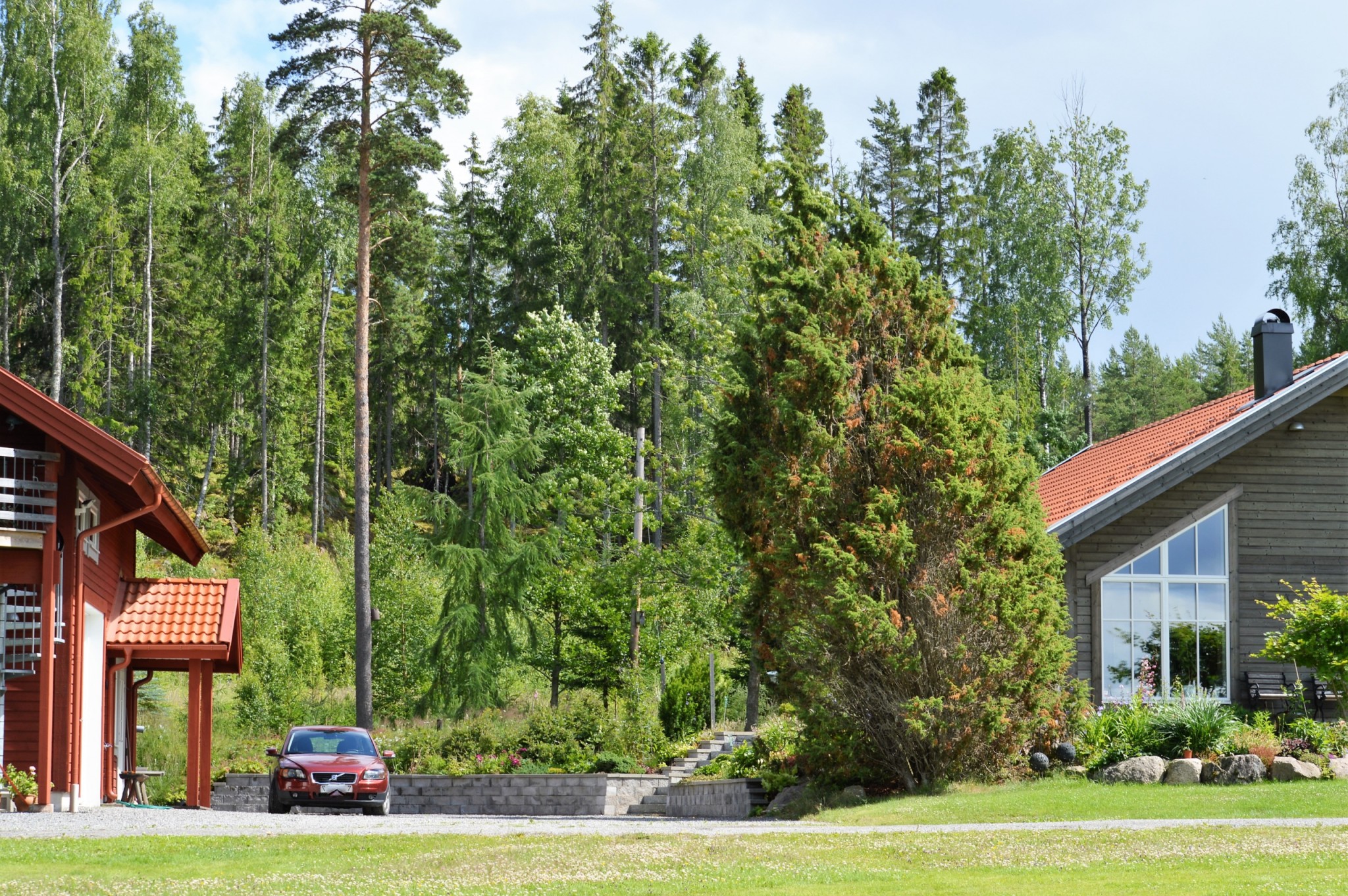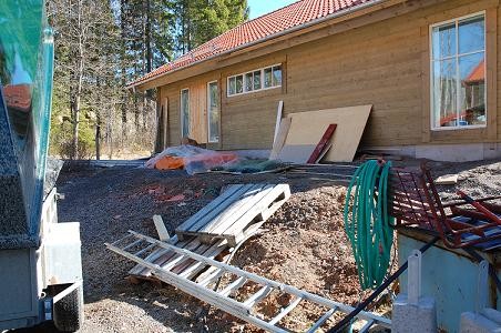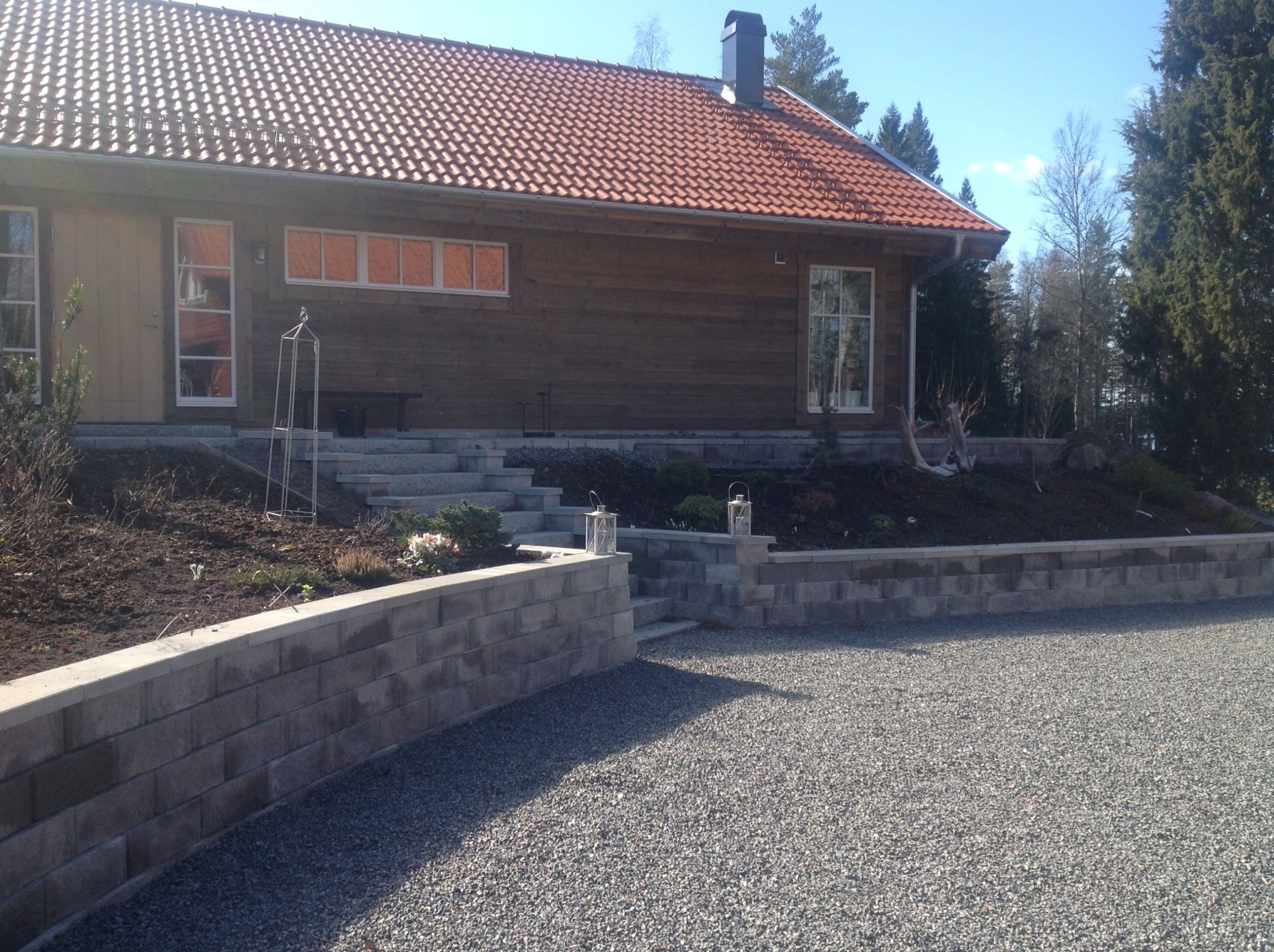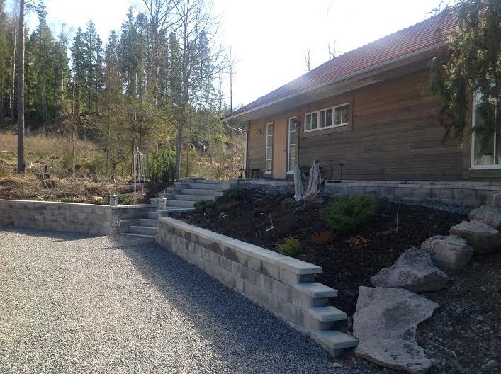 Tack för svaren. Ja vi är själva mycket nöjda med resultatet. Trappstegen är i granit och fick lyftas på plats med kran. Det trickiga med dem är att de lätt blir isiga när det är runt 0:an, då blir det lite sand. Rabatterna ligger i skugga stor del av året men då växer det ju i och för sig inte så mycket ändå. Det är barrväxter, buxbom, ljung, daggfunkia i rabatten vid huset. Markbädden har fått en häck av idegran och en massa häxalar som skall täcka ytan.