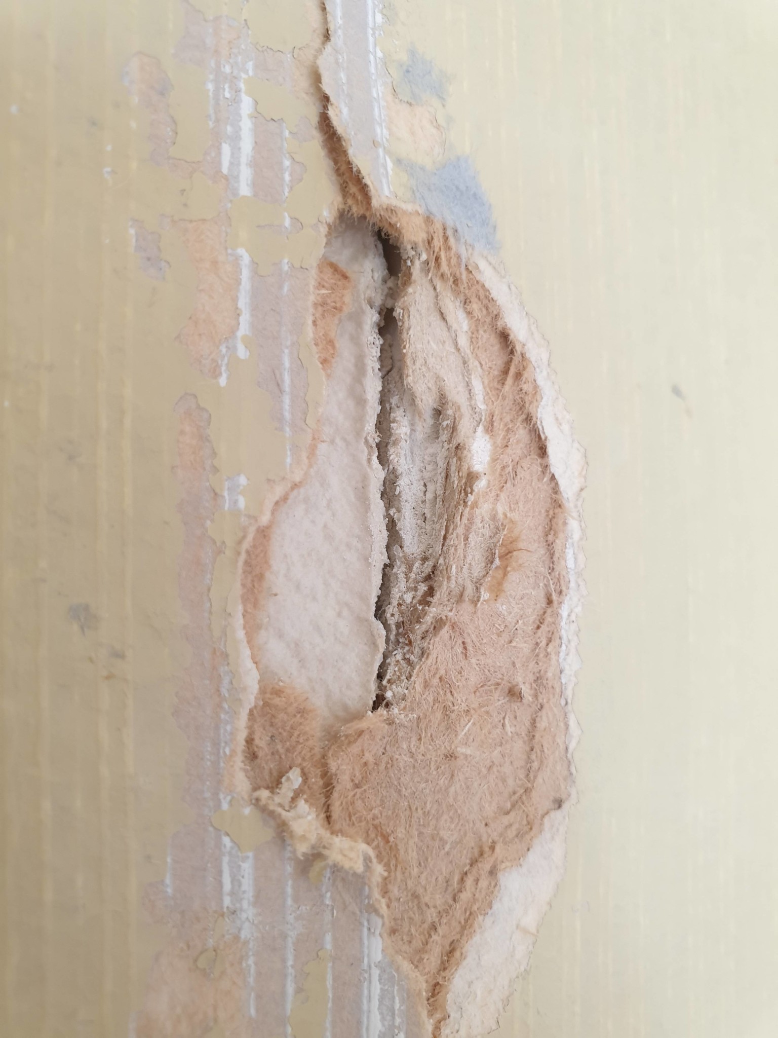 Angående varför jag skrev "inåtbuktande?": det är inte helt uppenbart att det är en gipsskiva som sticker ut på ena sidan jämfört med resten av väggen, snarare att den andra skivan bultar inåt. Idéer om hur jag enklast tar reda på vilket fall som gäller?