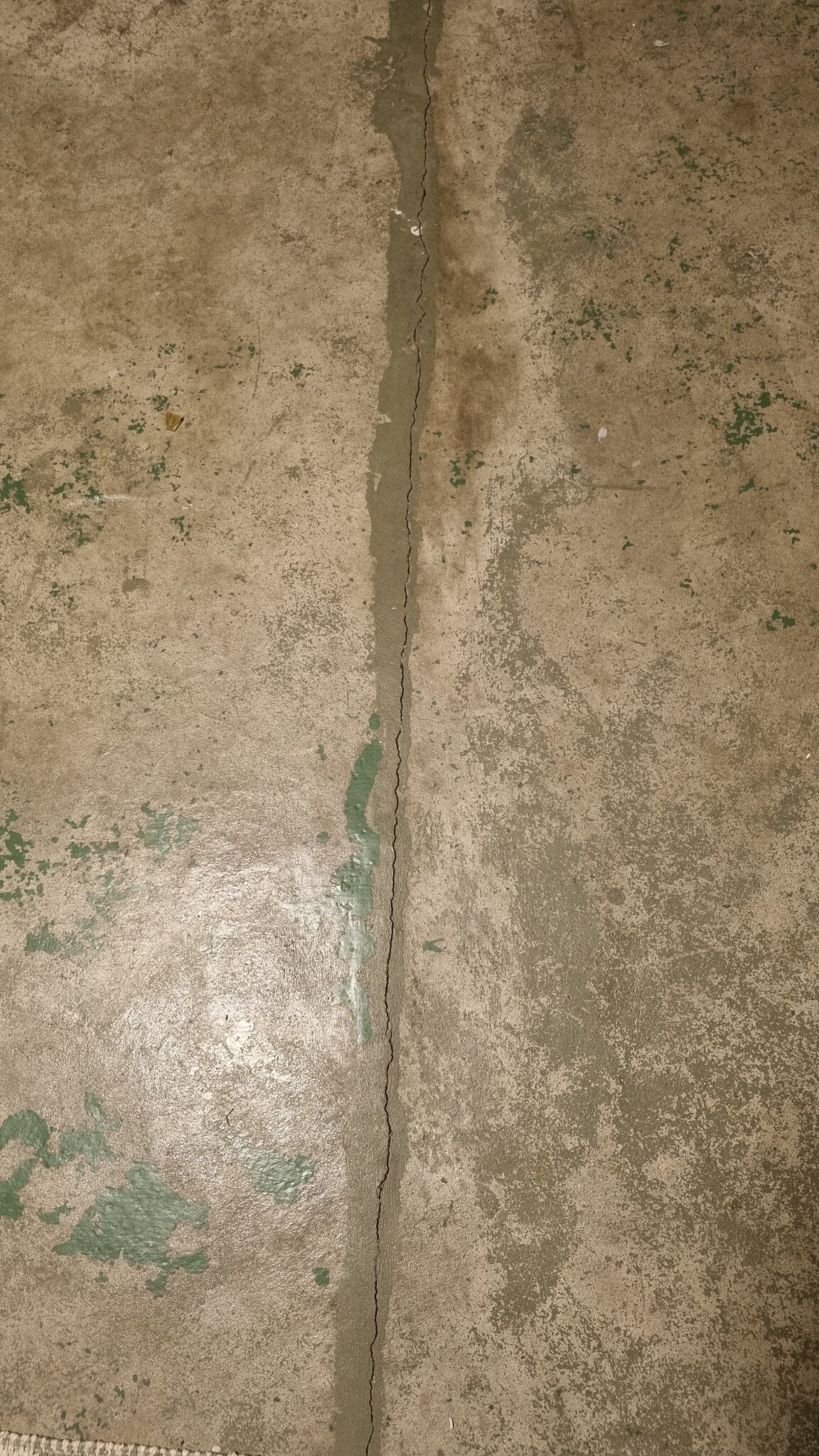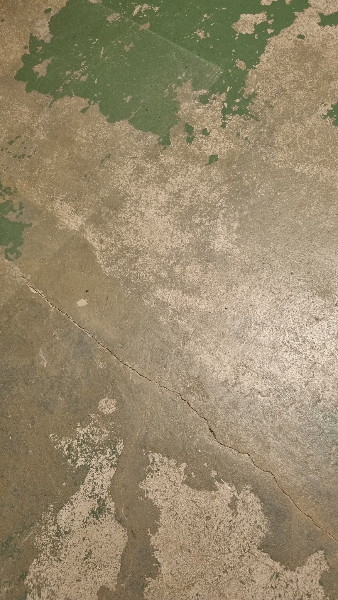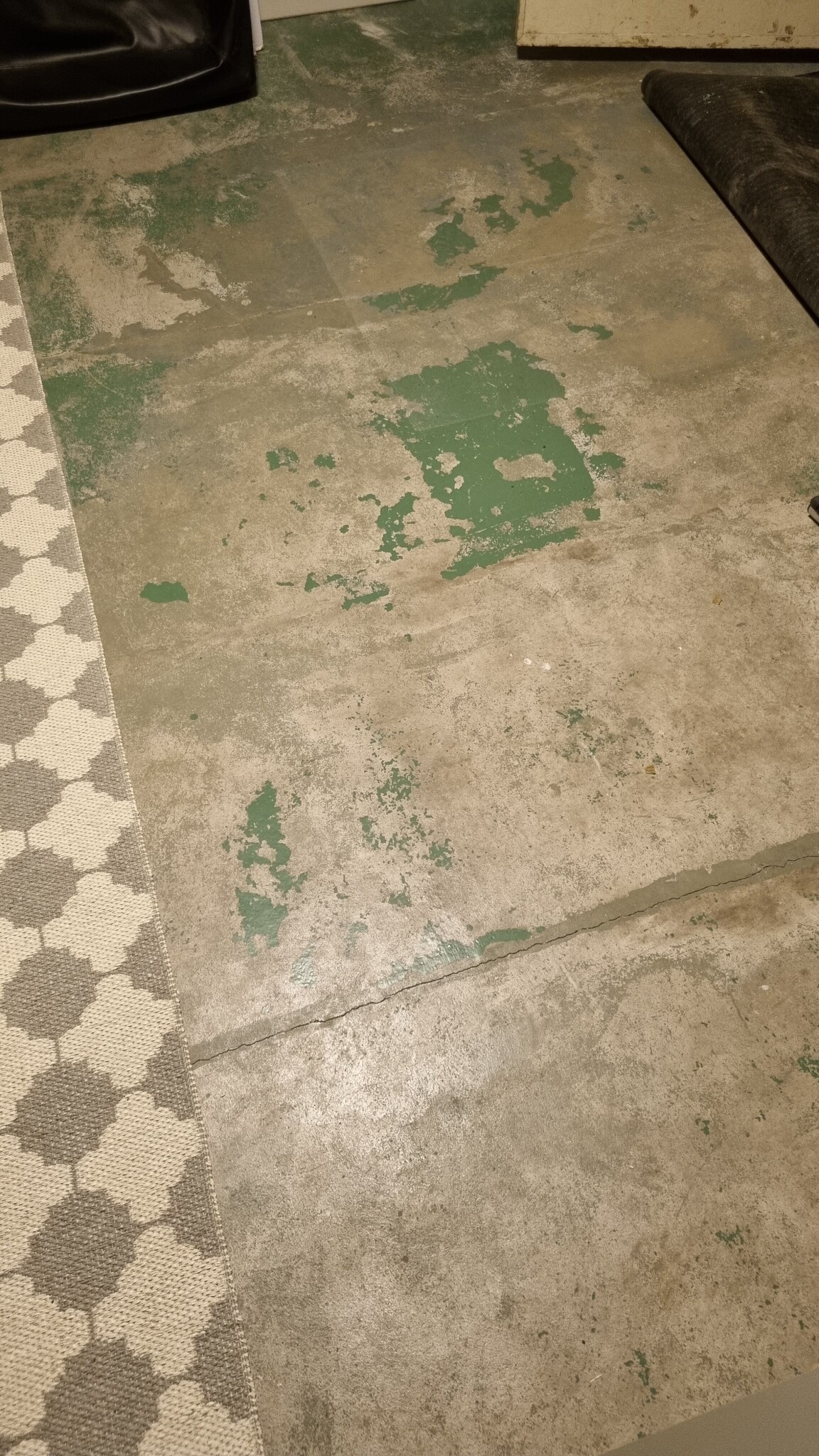 Vi håller på att renovera källaren och i ett av rummen är det väldigt lågt i tak. Här har betonggolvet varit målat och rester av färgen finns kvar.