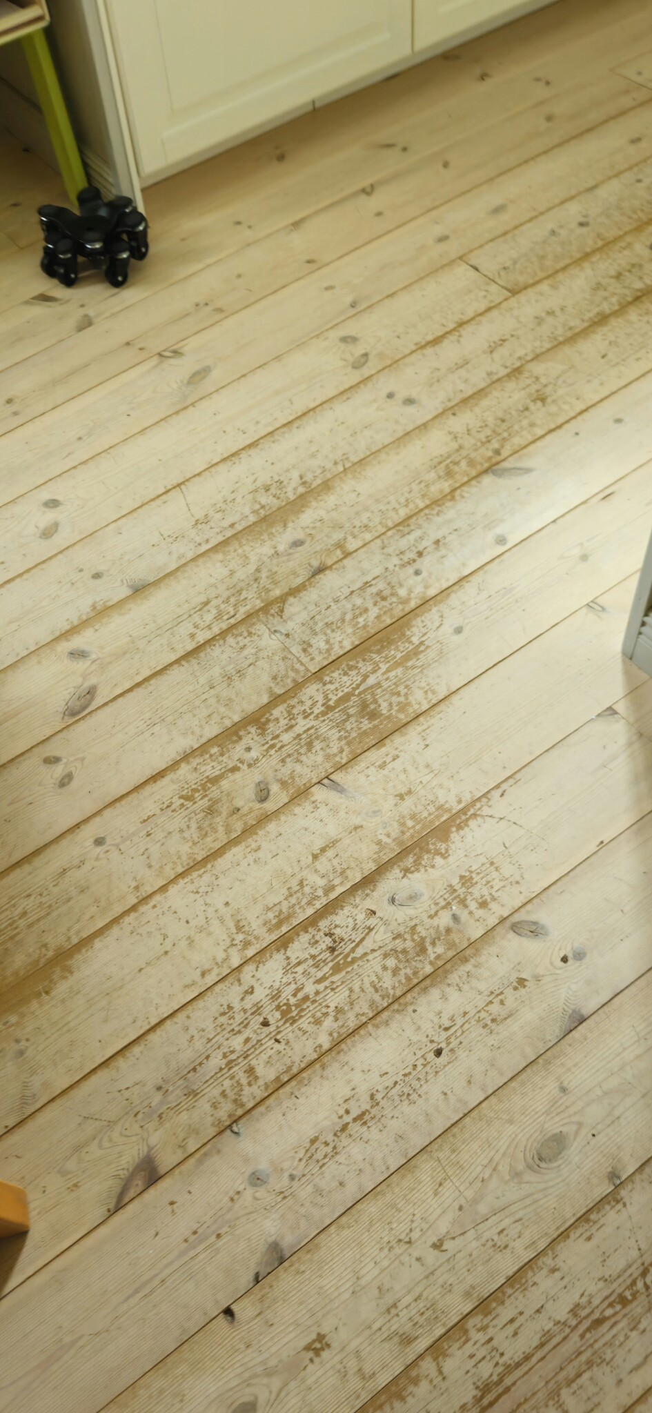 Har ett vitbetsat furugolv, ser ut så som bilderna visar. Vad kan räknas som normalt slitage efter 8 år på ett sådant furugolv. Bilder tagna i kök, matplats, dvs. Dessa områden används mest i huset.