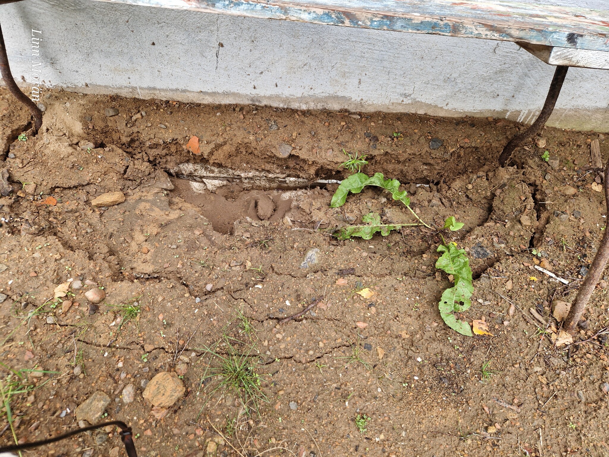 Har nyss köpt ett hus där förra ägaren gjorde en del dräneringsarbete förra året. Efter skyfall har det nu blivit ett slukhål på ett ställe där dräneringen fixats, alldeles intill grunden. Grunden ser fin ut och jag hittar heller inga konstigheter i källaren. Är det bara marken som satt sig lite pga dåligt packad efter jobbet eller är det något värre än så? Och vad är det vita materialet? Det är mjukt och är "utanför" grunden och under är det ett hårt (plast?) material, som jag gissar hör till dräneringen.