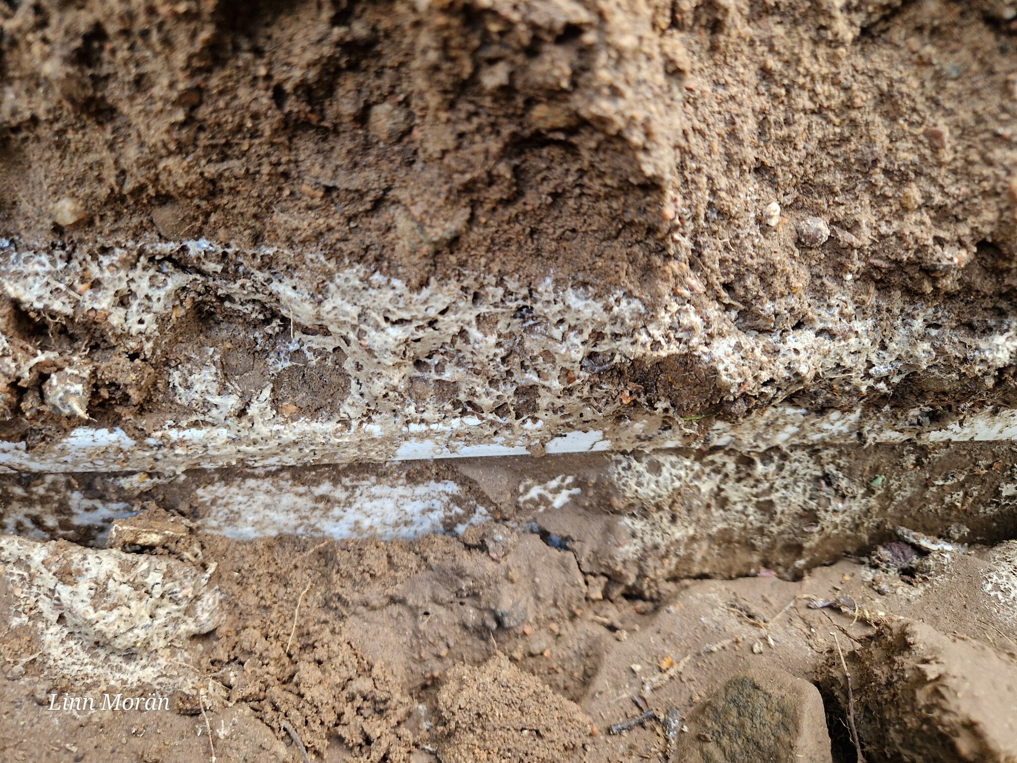 Det vita är troligen en plastlist som sitter ovanpå Isodrän/Pordränskivorna eller cellplasten som utgör själva dräneringen och isoleringen. Får jag gissa har det varit en dålig packning av massorna som lagts tillbaka efter dränering som gör att vatten nu packar det och orsakar sättningar på toppen.