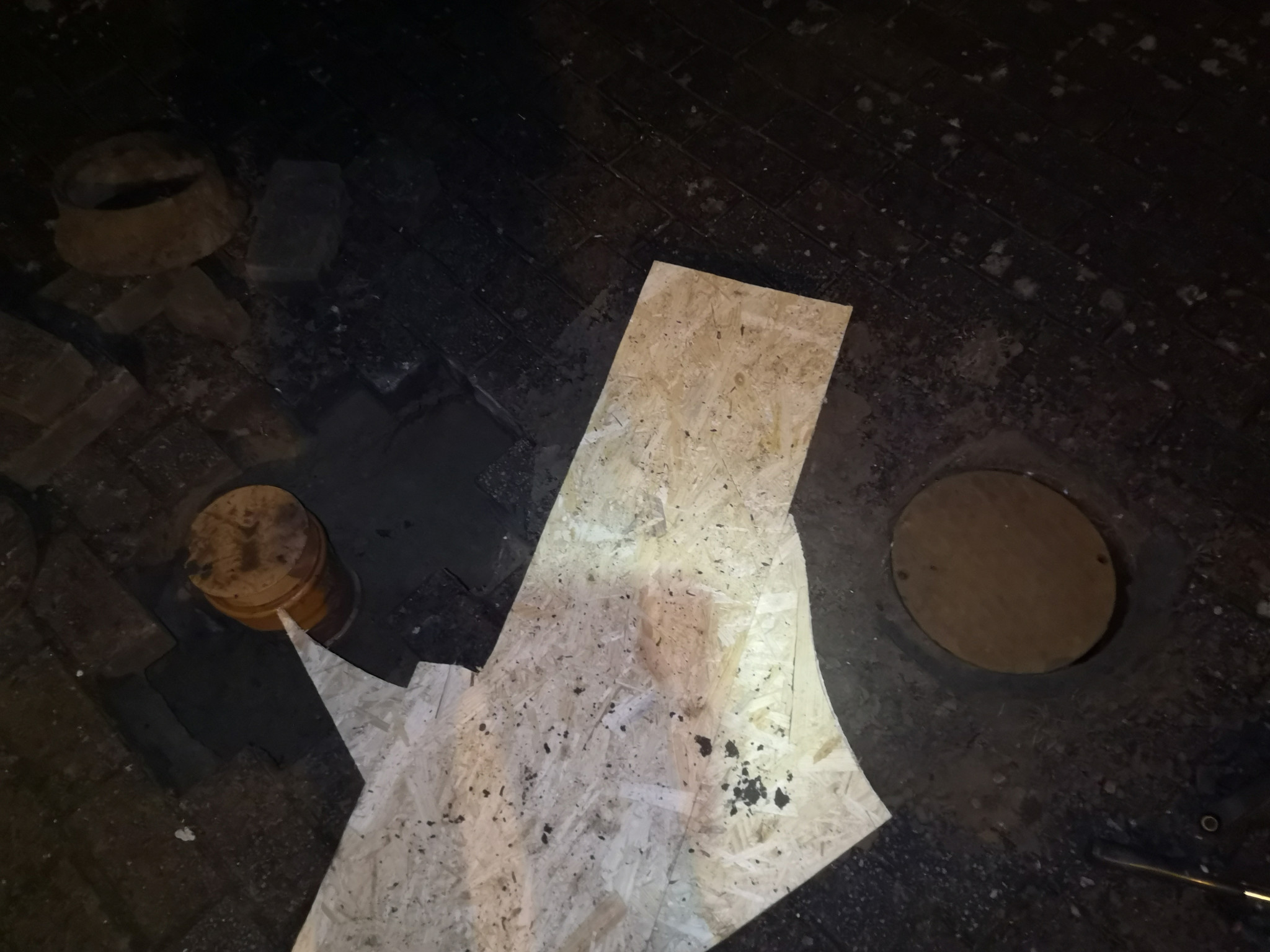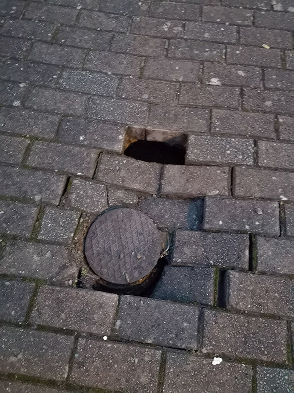 Till vänster är då spolbrunnen och till höger dagvattenbrunnen. Runt dagvattenbrunnen verkar allt ok utan större sättningar.