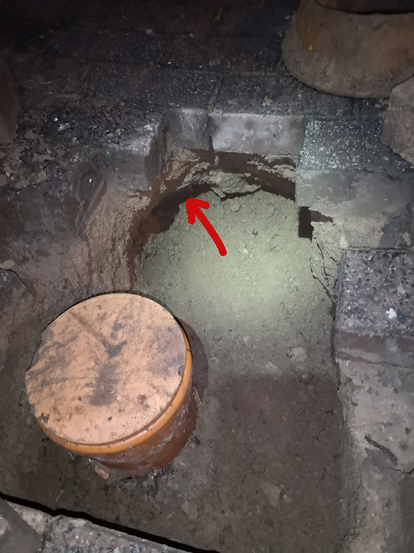 Stenläggningen runt den ena brunnen (som jag nu förstått är spolbrunnen) har varit lite nedsjunken, men nu idag har helt plötsligt en sten trillat ner i vad som verkar vara ett mindre slukhål.