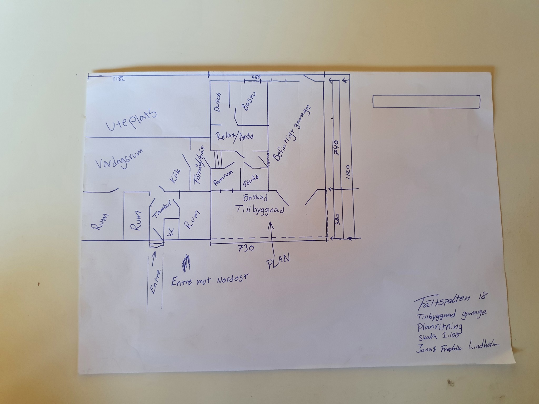 Ena sidan är 2,7 meter och nuvarande yttervägg är 2,4 meter. Det ska byggas ut med 3,8 meter på längden och 7,3 meter brett.