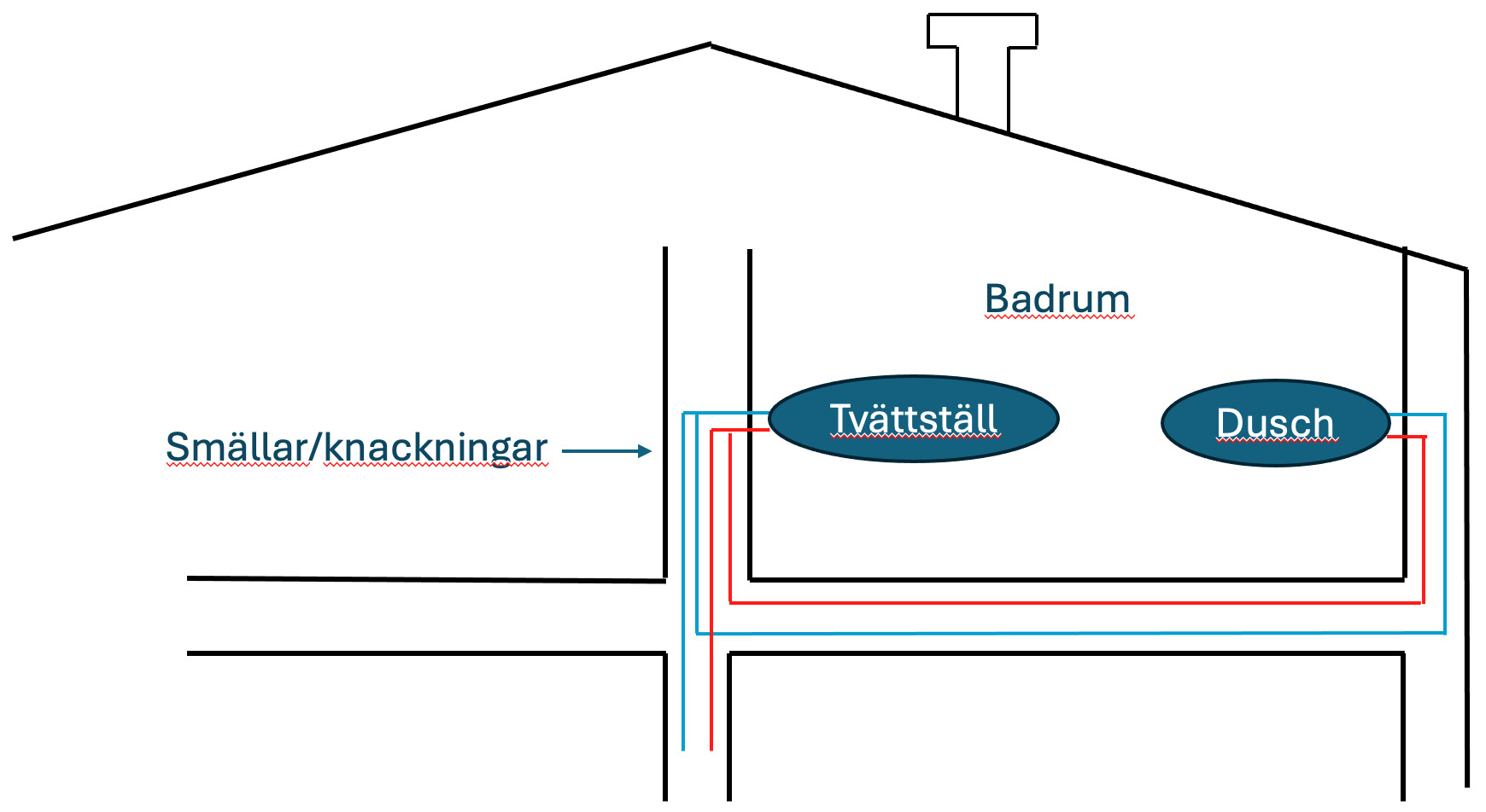 Det är ett badrum på ovanvåningen som ligger vägg i vägg med ett sovrum. Handfatet är mot väggen mellan rummen och vattenledningarna går i den väggen. När man spolar varmvatten, handfat eller dusch, börjar det smälla väldigt mycket i väggen, man hör det tydligt från sovrummet. Det är smäller hela tiden, kontinuerligt en gång per sekund, och håller på hela tiden när man spolar och även en stund efter att man slutat.
