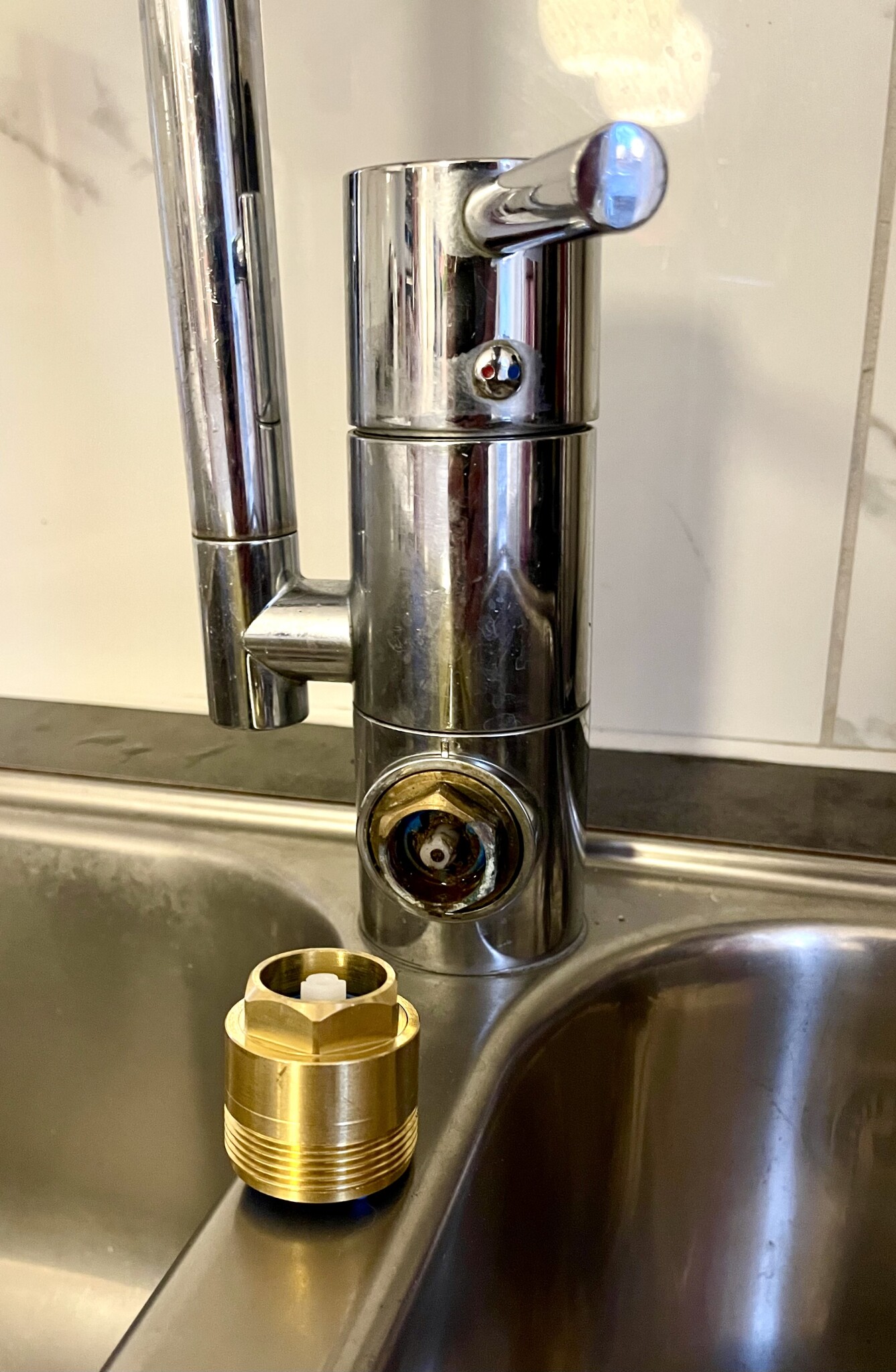 Vredet för vatten till diskmaskin på min köksblandare har gått sönder (skruven som håller den på plats gick av…).