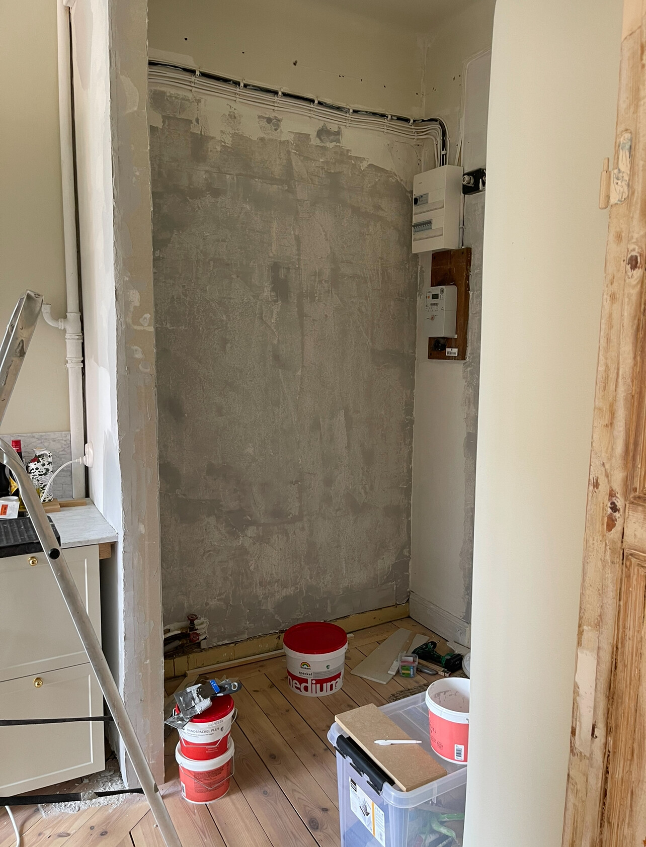 Det jag helst skulle vilja göra är som på skissen jag har ritat. Att ha någon slags avtagbar lucka så att man kan ta av den och komma åt skåpen. Men är osäker på hur jag får till en sån lucka? Den skulle bli hög och tung - håller magneter? Hur får jag den att ”smälta in” så att den nästan ser ut som en del av väggen?
