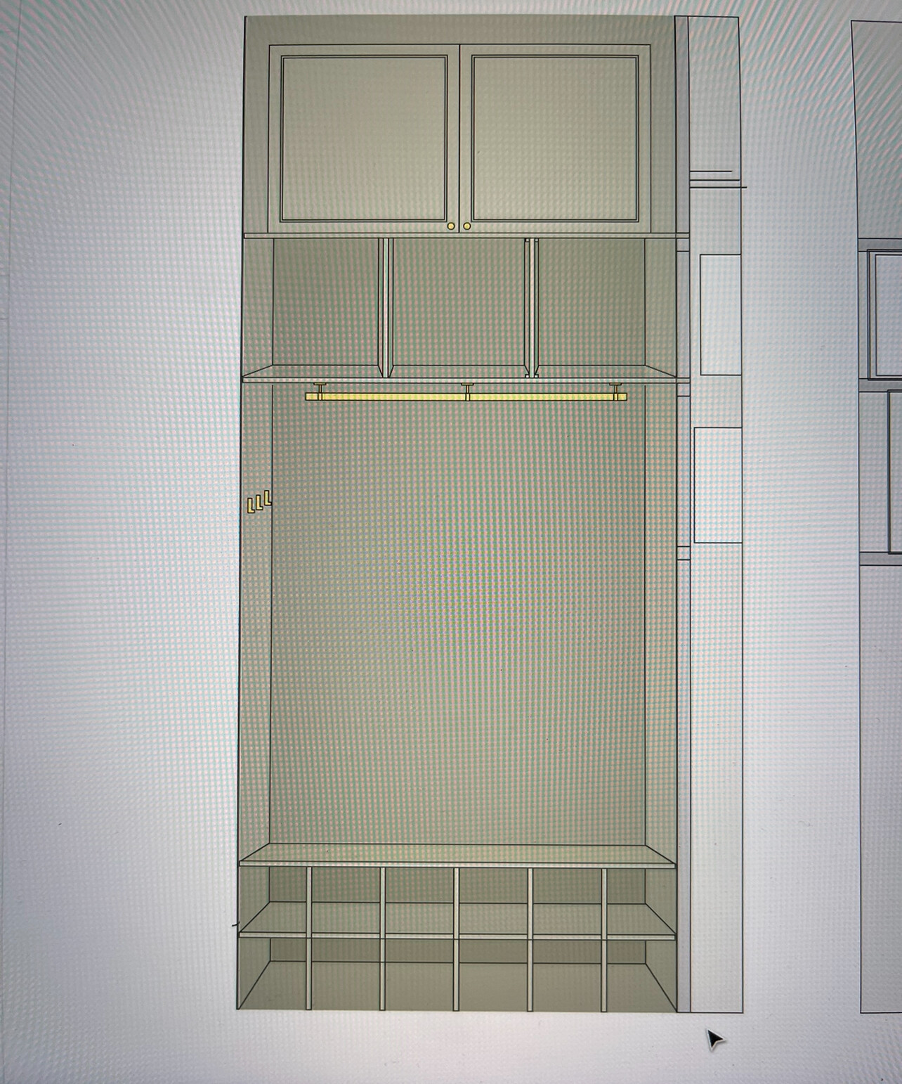 Min senaste lösning som är den enklaste är att bygga en vägg och sen sätta en gardin man kan dra undan för proppskåpen. Och sen sätta upp en hatthylla och ha en skohylla på golvet.