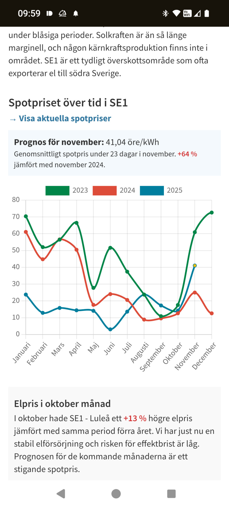 Eftersom man har byggt en ny ledning för elöverföring till Norra Finland och att SSAB och STEGRA m.fl. i Luleåtrakten kommer att förbruka väldigt mycket mer el så är det sannolikt att elpriserna även i SE1 kommer att öka väsentligt - lönsammare med solceller OCH AI-styrd batterilagring av egen el! Notera dock att solpanelerna bör monteras i 60 eller helst 90 graders lutning för att optimera utbytet då solen ligger lågt. Detta minskar även tiden för snöpåslag.