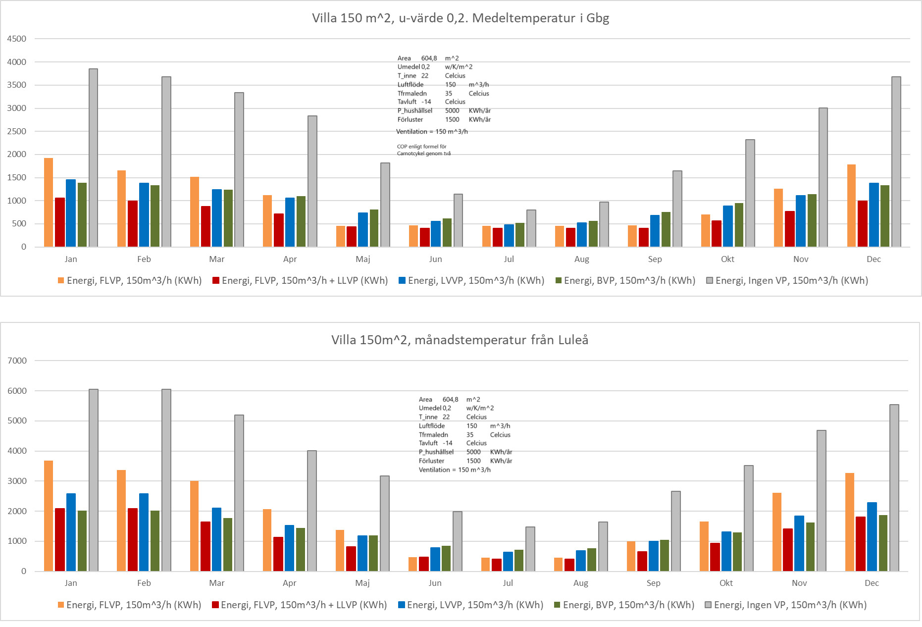 Vad är antagandet för hur en bergvärmepump klarar ventilationen, är det en FTX eller utan återvinning? Jag har nämligen väldigt svårt att förstå hur en BVP i Luleå i Januari inte kan göra av med mindre energi än en FLVP+LLVP som jobbar med betydligt lägre temperatur på värmekällan under de förhållandena, såvida inte energiförlusterna inkluderar ouppvärmd friskluft.M maarten70 skrev:I tillägg till ovan, här är motsvarande kalkyl där andra typer av VP än FLVP och LLVP är medtagna. De tillagda VP-typerna är inte verifierade mot verklig förbrukning då vi inte har dessa men som sagt, för FLVP och LLVP stämmer de mycket väl. Dock större osäkerhet för LVVP och BVP.