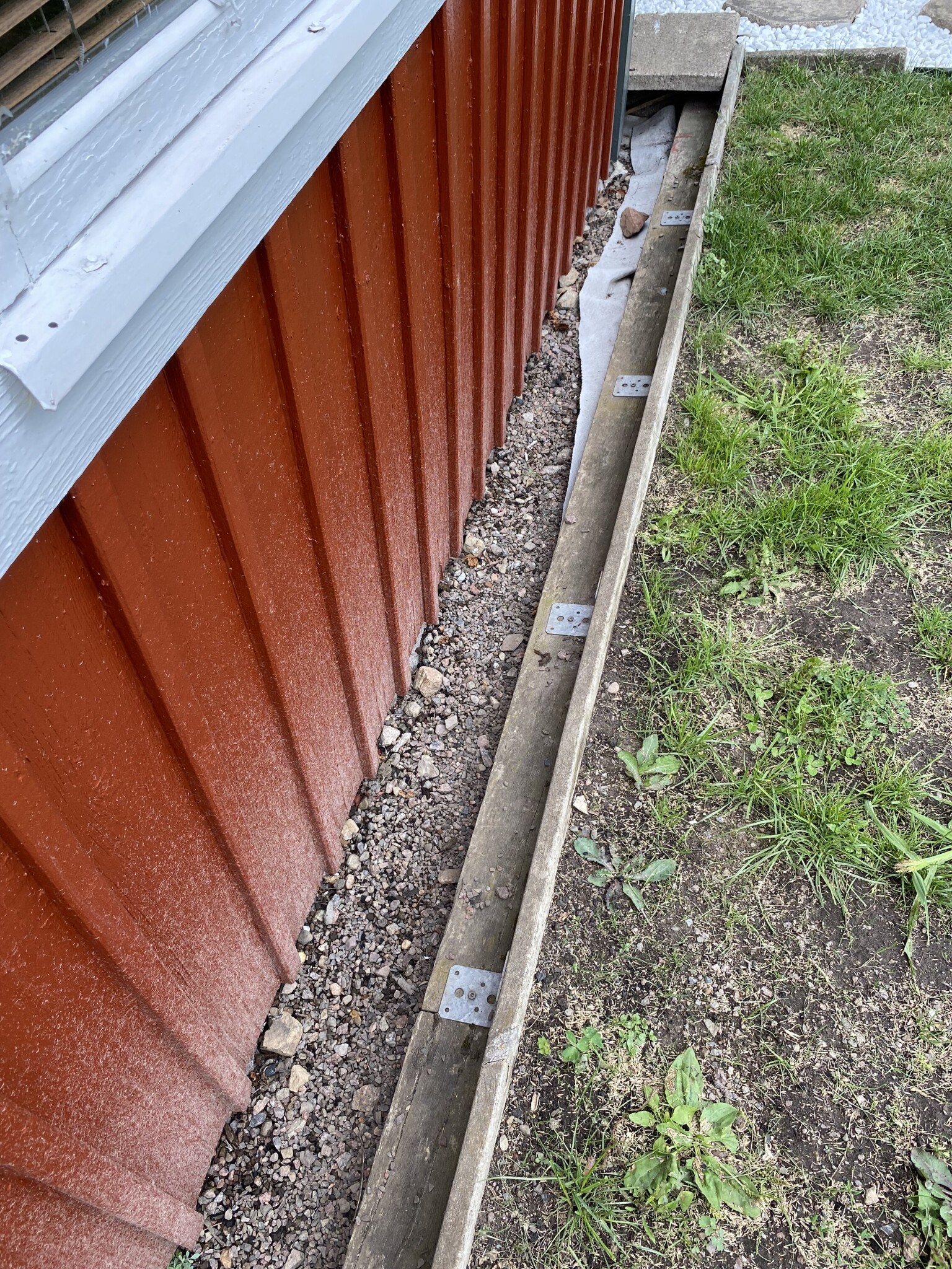 Väggen är nymålad. Det stänker upp smuts på väggen. Vad beror det på. Är det att gräset inte växt upp eller är det stenarna längst ner vid väggen.