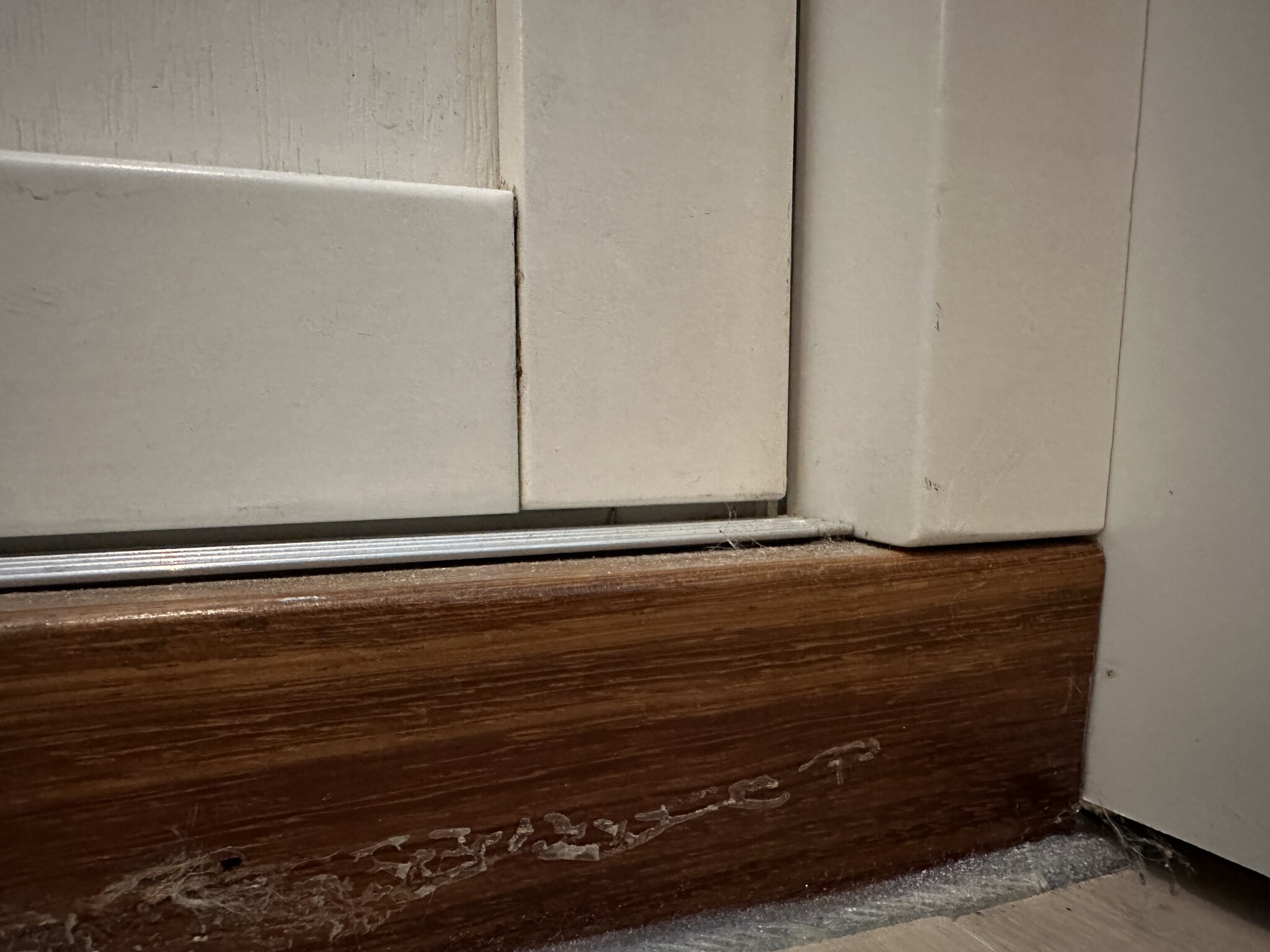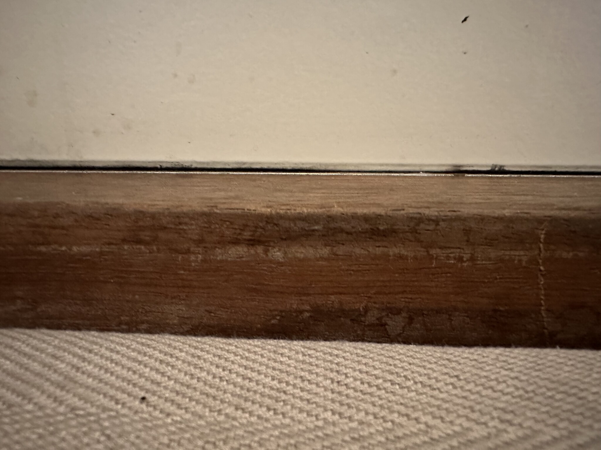 Behöver sätta två stycken smyglister vid ytterdörr och altandörrens tröskel. Denna är troligtvis i ek, men mycket mörkare än ”vanlig ek”.