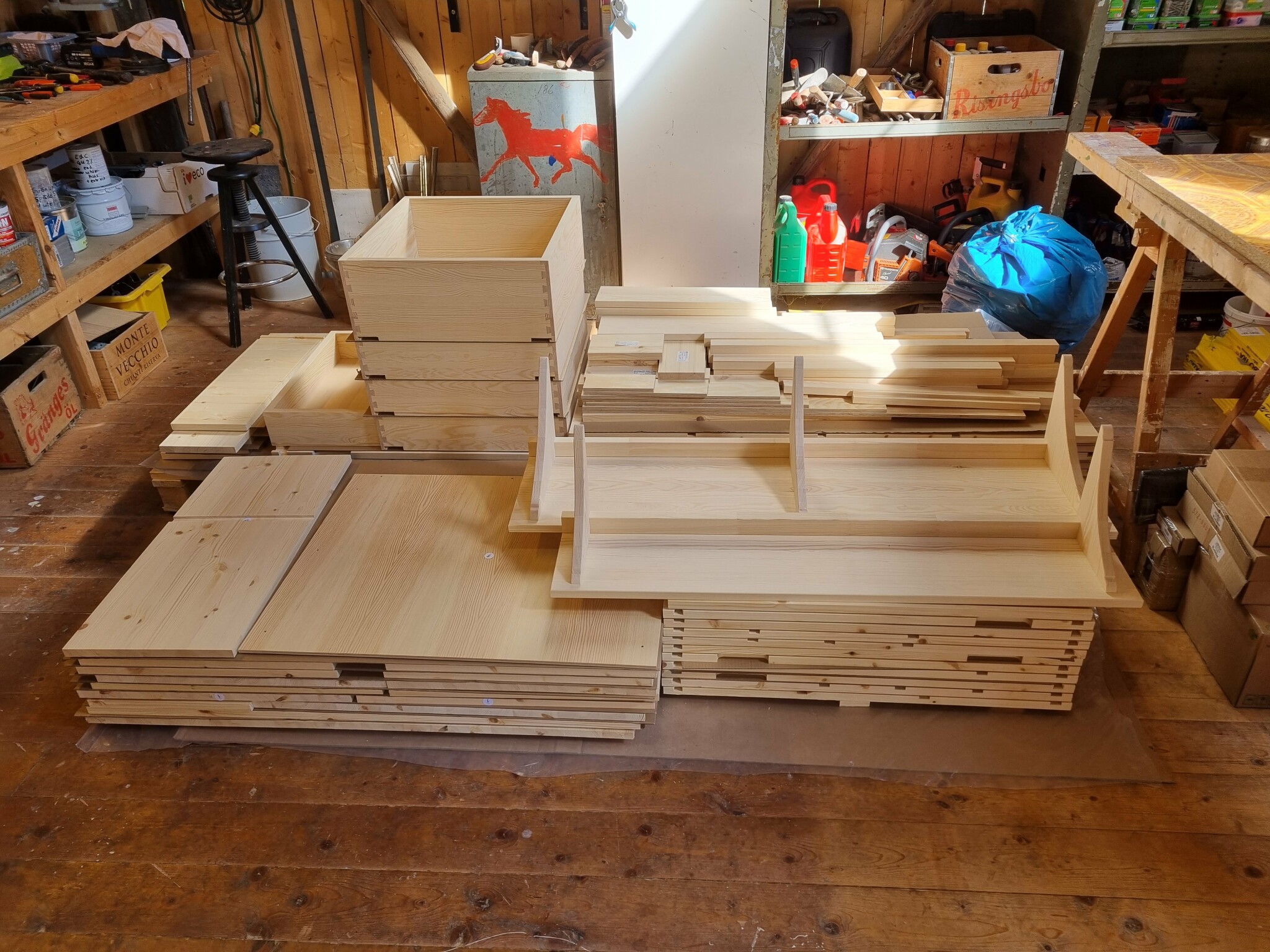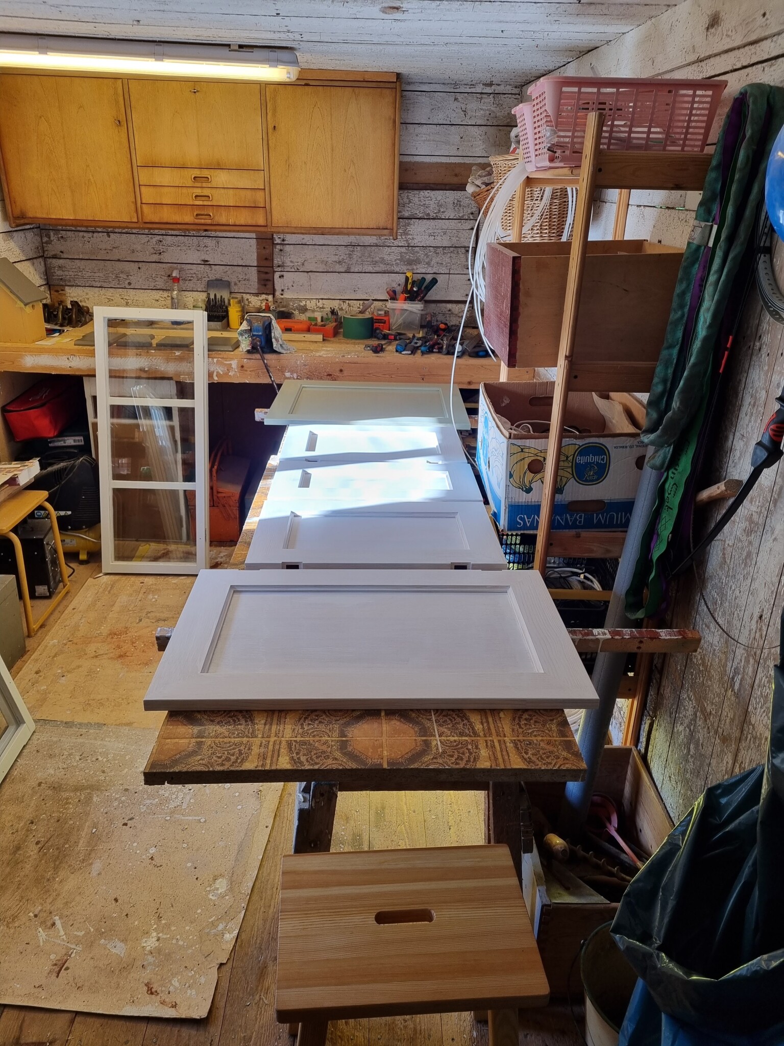 Jag valde att köpa omonterat, då kommer det i "platta" paket. Men det är betydligt mer meck än att sätta ihop IKEA kan jag säga. Jag tog luckorna och lådorna monterade. Snek rekommenderar det, då det är svårt att limma ihop dem så det blir både plant och i vinkel.
