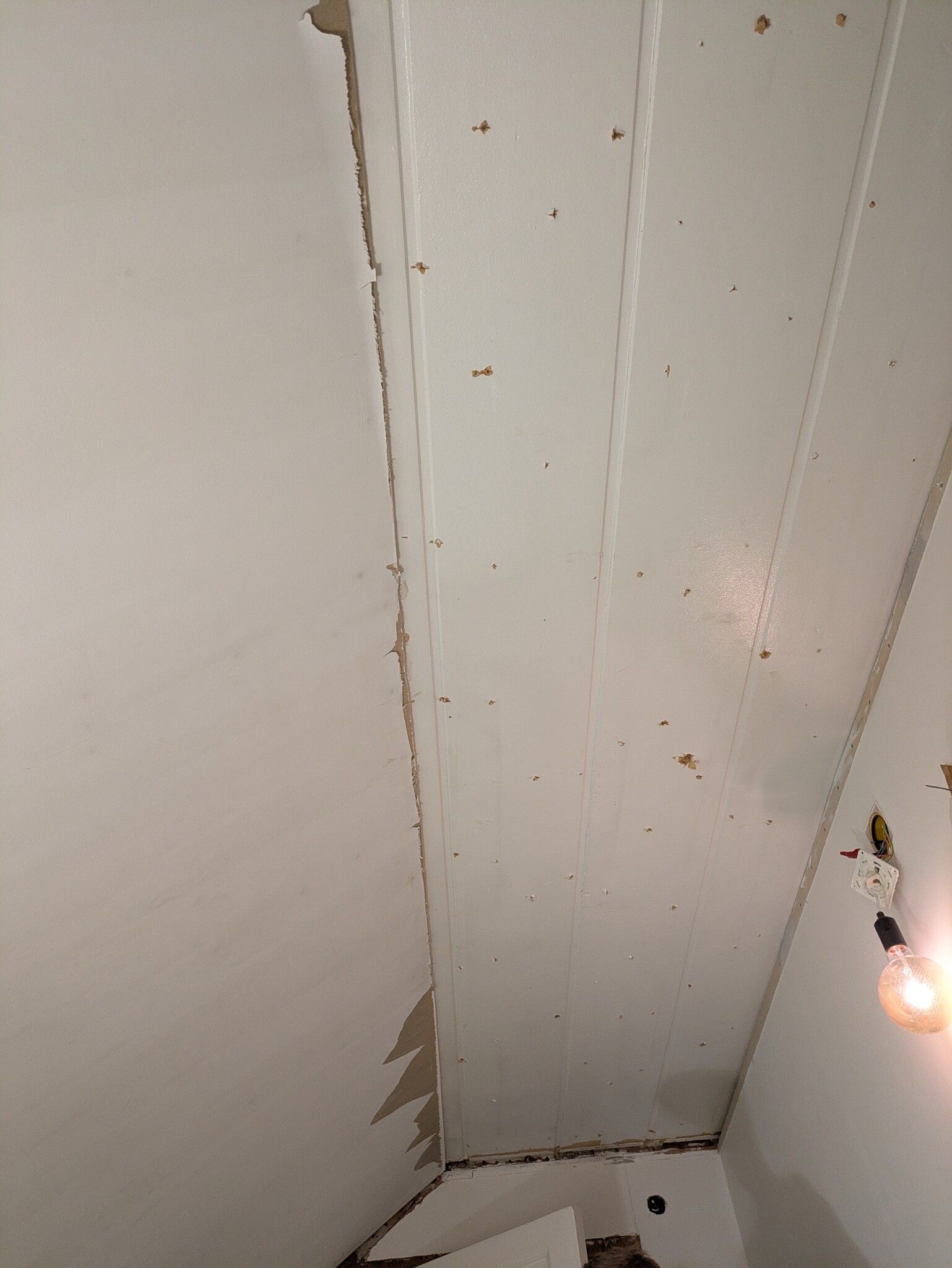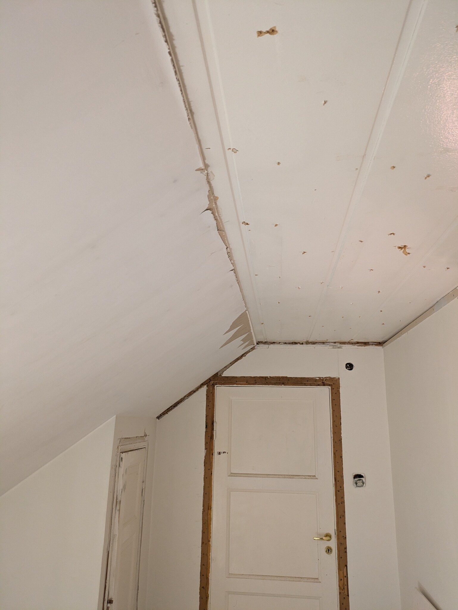 Gör avslutet rakare genom att sänka taket något, om det behövs. Gera gipsskivorna i mötet och sätt dem tight mot varandra, och använd tec7 i skarven. Då slipper du spackla en massa i onödan och kan använda skivorna som sitter i det snea taket.