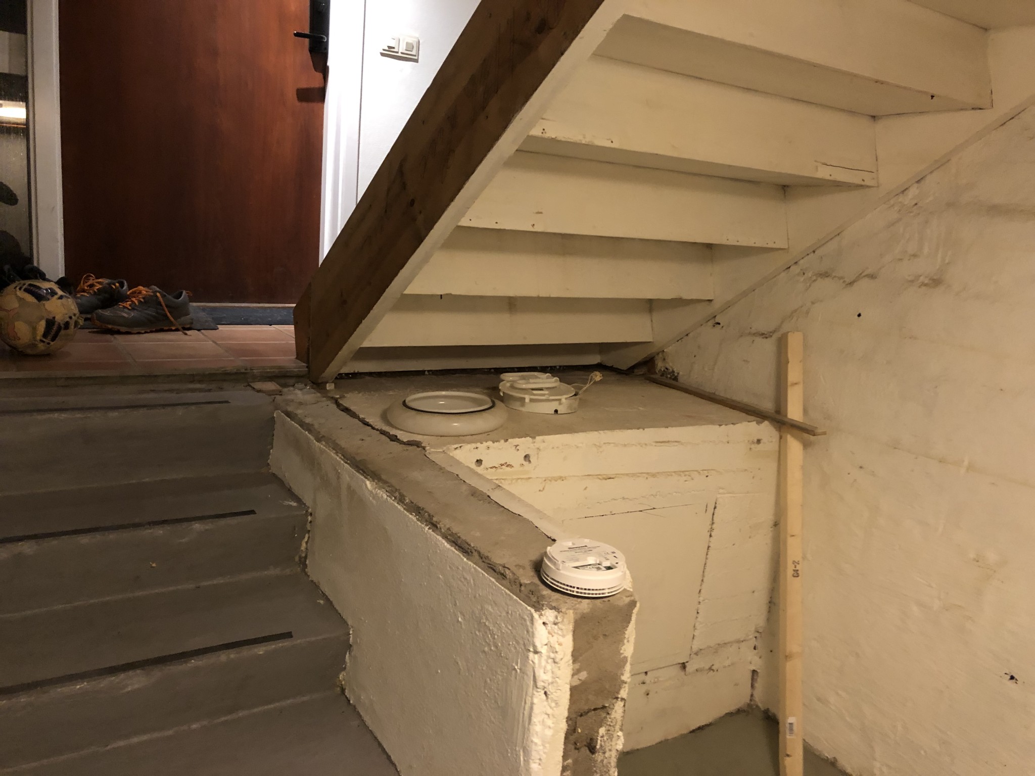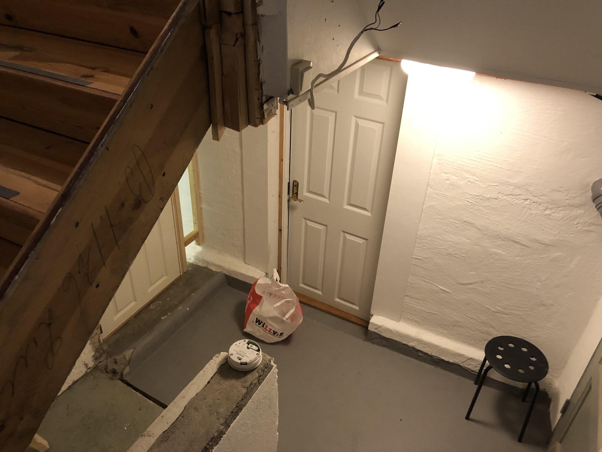 Längs trappa 1 (överst) är räcke liksom ovanför trappa 1, skulle gå att ha kvar men jag antar att det blir snyggare med enhetliga räcken. Bredvid trappa 2 är vägg som ännu inte är riven, bredvid trappa tre och fyra är väggen riven.