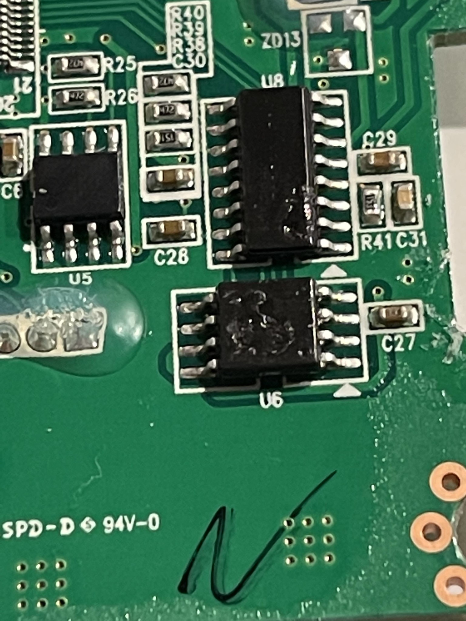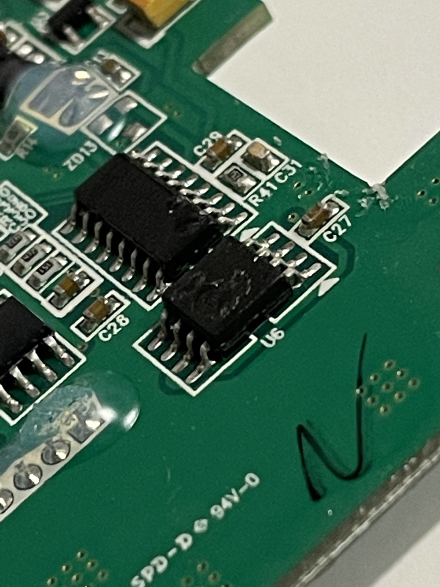 Nja, skulle säga att det ser ut som skyddslacken (för att förhindra fuktproblem) inte är helt täckande över IC-kretsen, samma gäller t.ex. U8. Däremot ser följande inte så friskt ut: