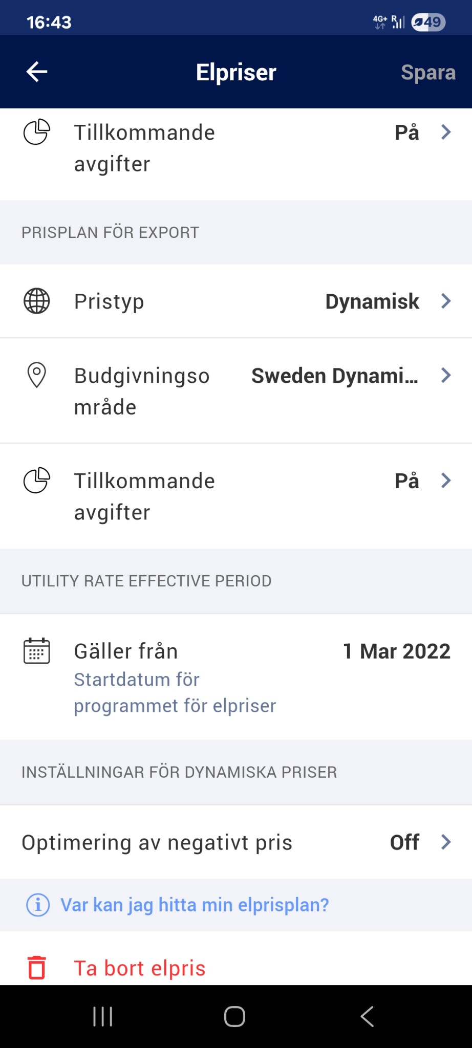 Installerade Solaredge 10k 2022 i appen finns denna där dras produktion ned vid negativa elpriserM merbanan skrev:Jag tror vi ska vara glada över att priset inte blir ordentligt negativt. Då skulle man behöva investera i logik som stänger av solcellerna när priset blir negativt, min växelriktare verkar inte ha något enkelt sätt att begränsa produktionen. Det verkar som att marknaden lyckas reglera det hela rätt så bra än så länge.