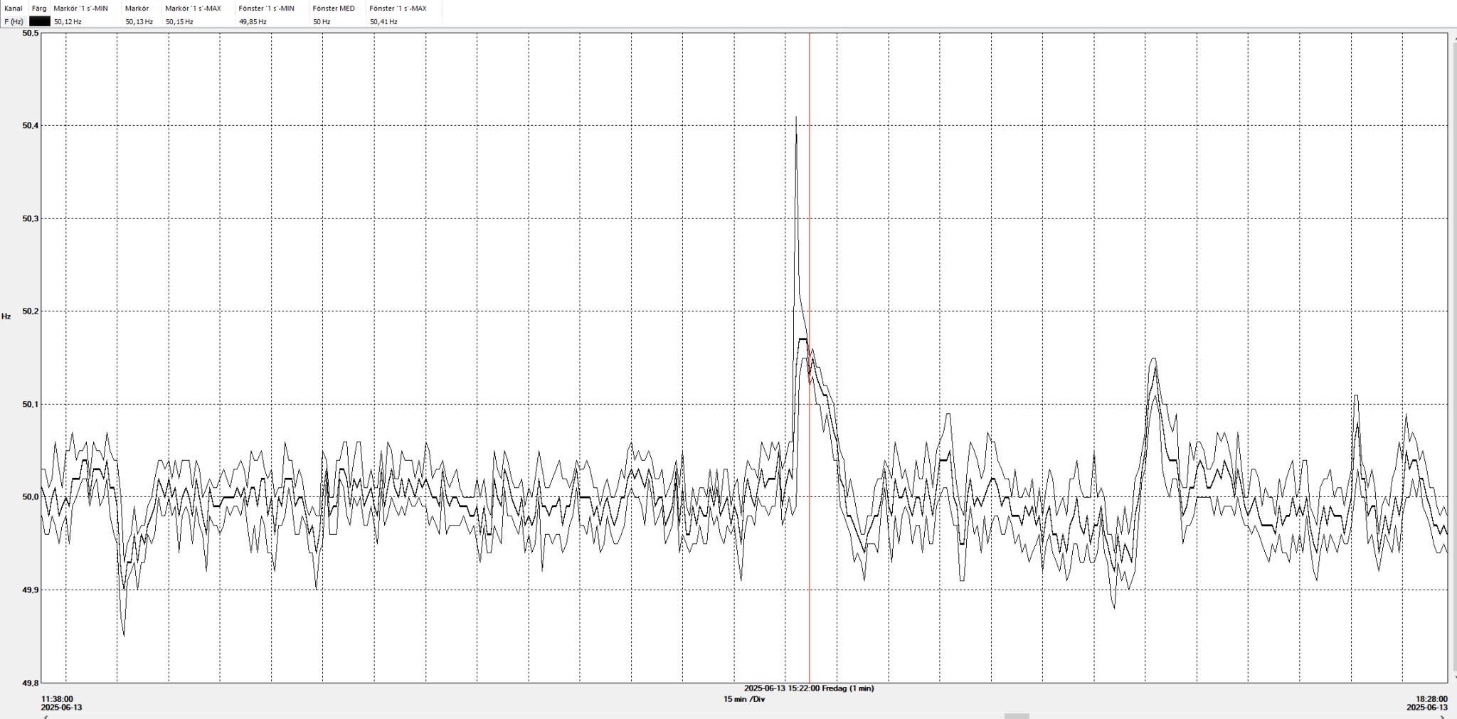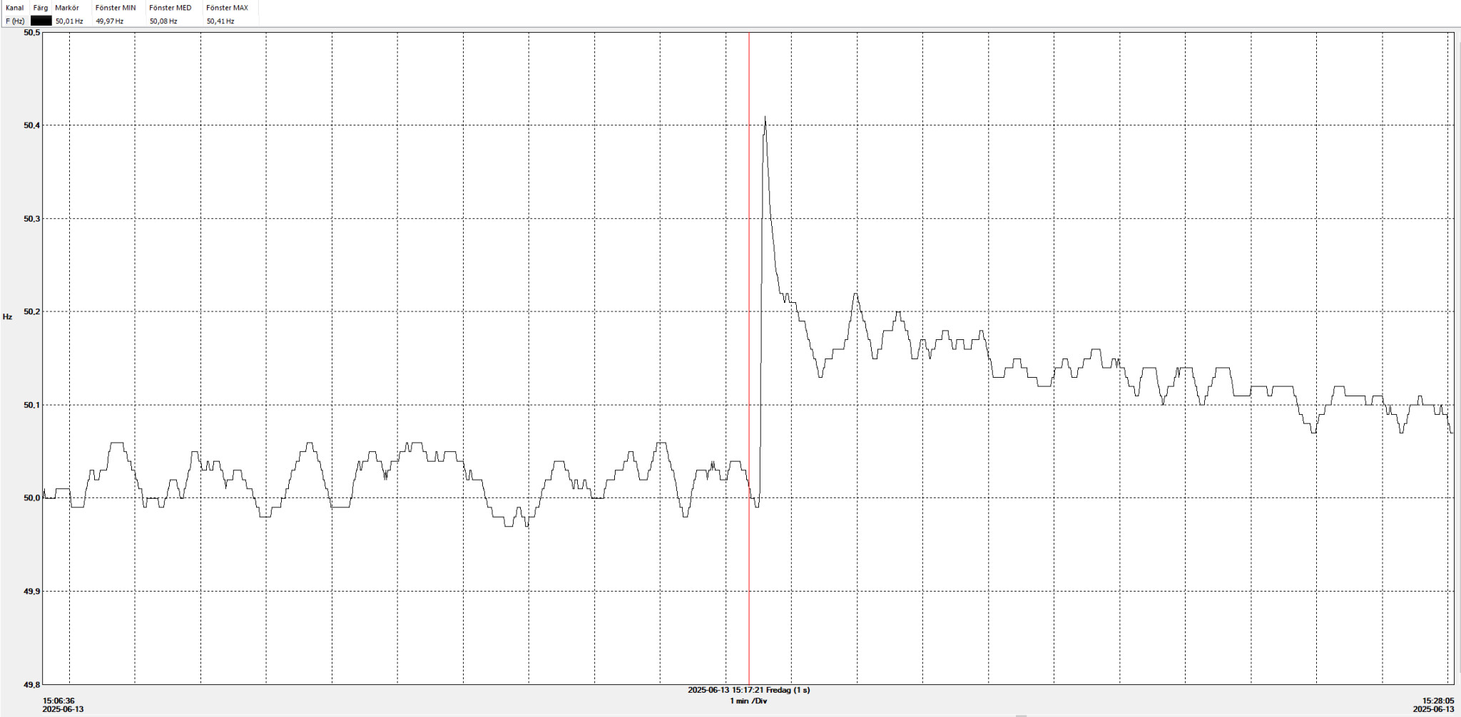 "Under lördagen 14 juni löste Nort Sea Link med 1400 MW export vilket fick frekvensen att stiga till 50,4 HZ."