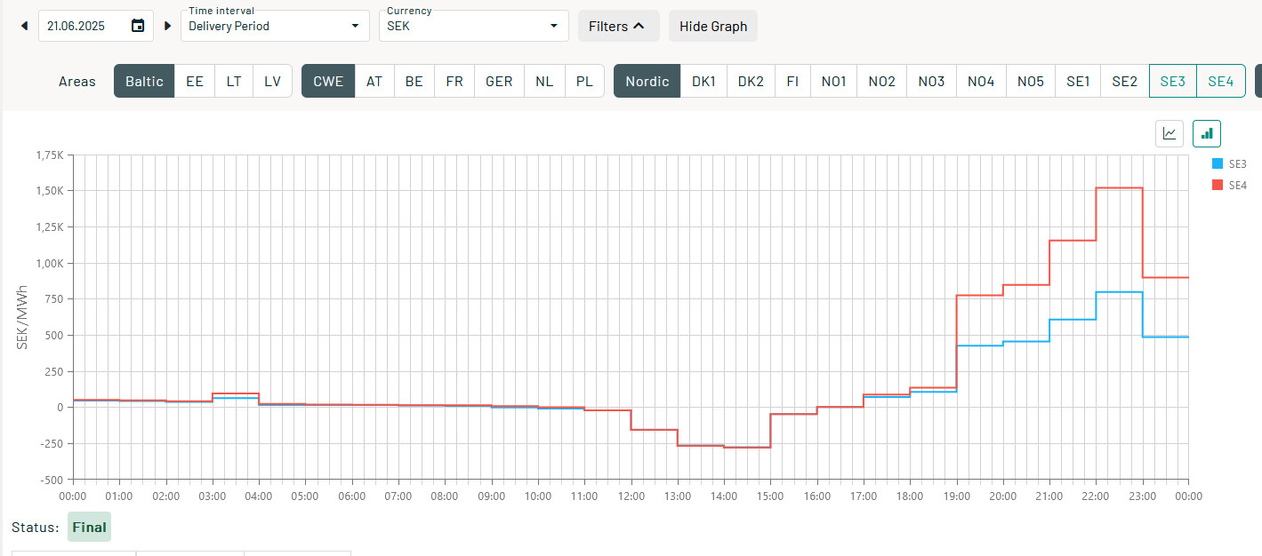 Tja, vi kan väl kika lite helt anekdotiskt på en av de senaste dagarna med riktigt högt elpris, den 21/6 kl 22-23. Då hade SE4 ett elpris på 1,51 SEK /kWhB BSA In skrev: