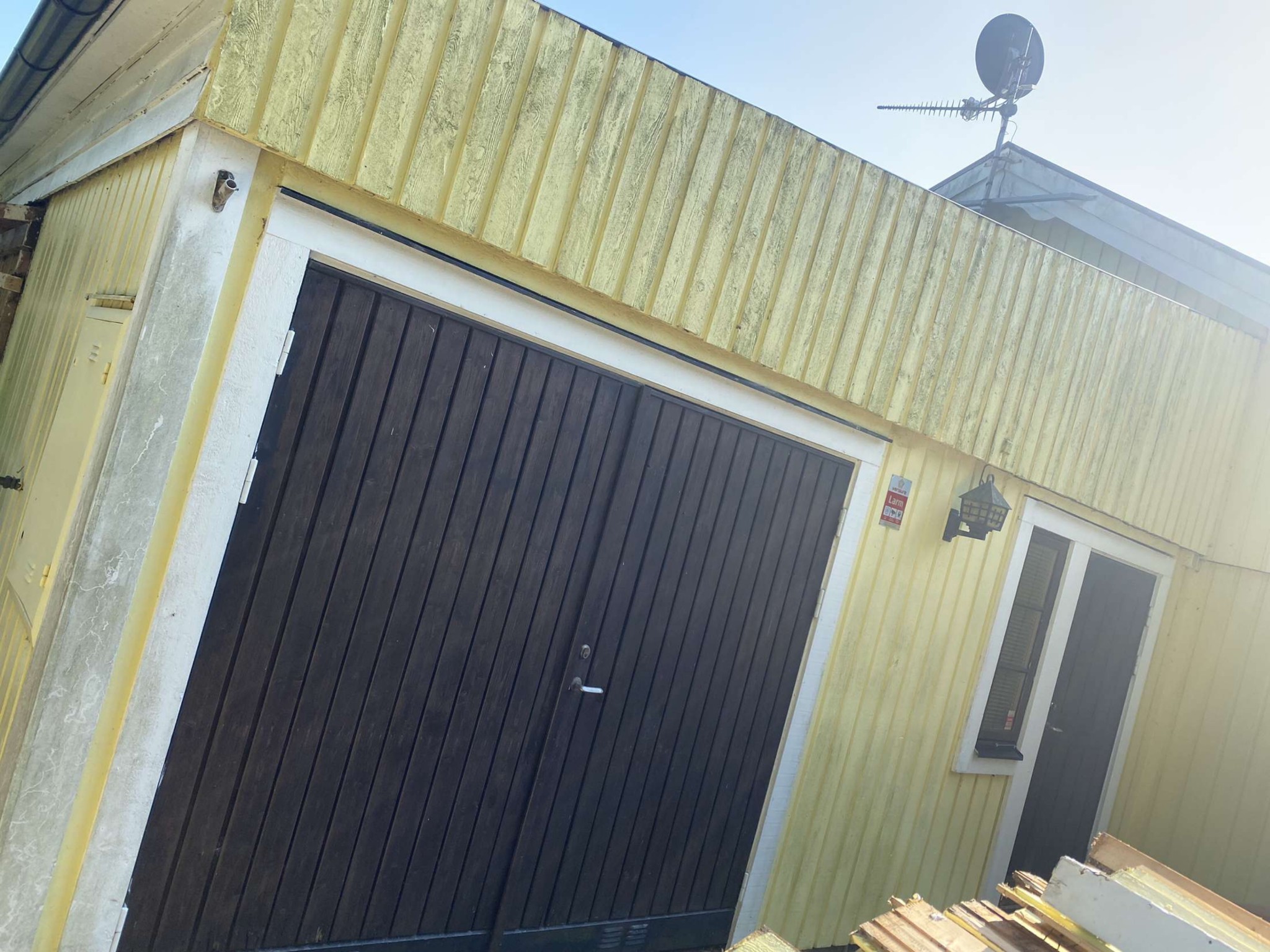 nu är det så att en stor fasadrenovering genomförs. När byggarna började riva vid det tillbyggda garaget så upptäcker dom att taket på garaget som har en lutande vinkel på ca 14* egentligen inte fyller någon större funktion då där är en brunn på taket som leder bort vatten.
