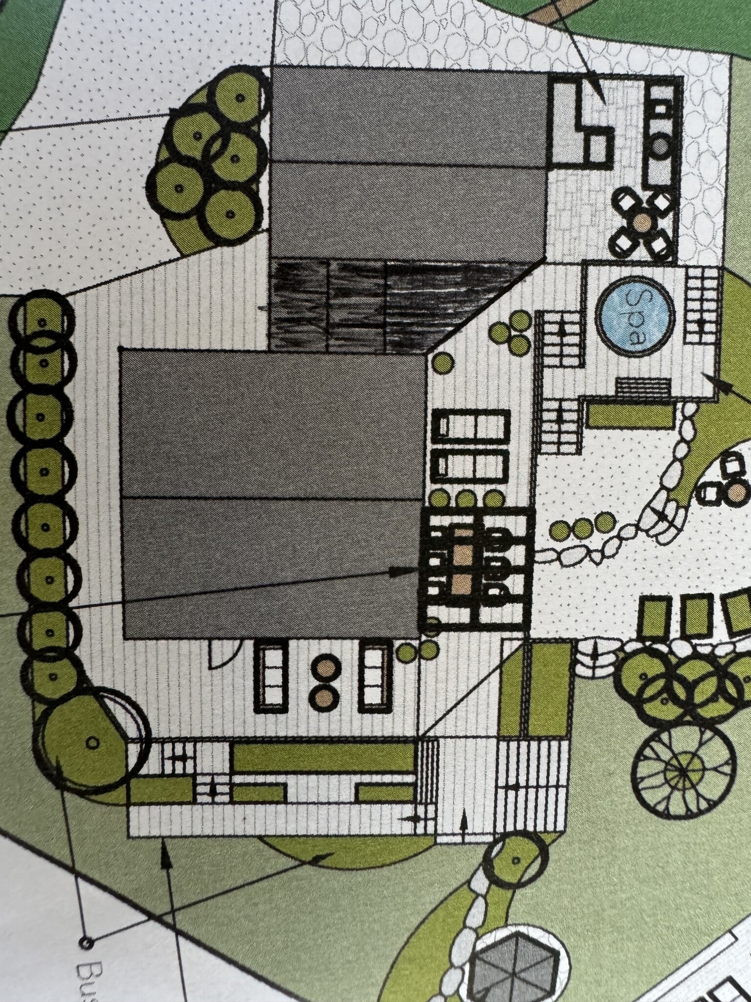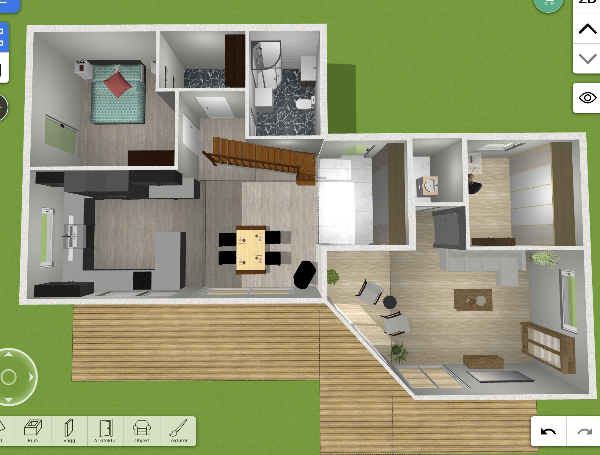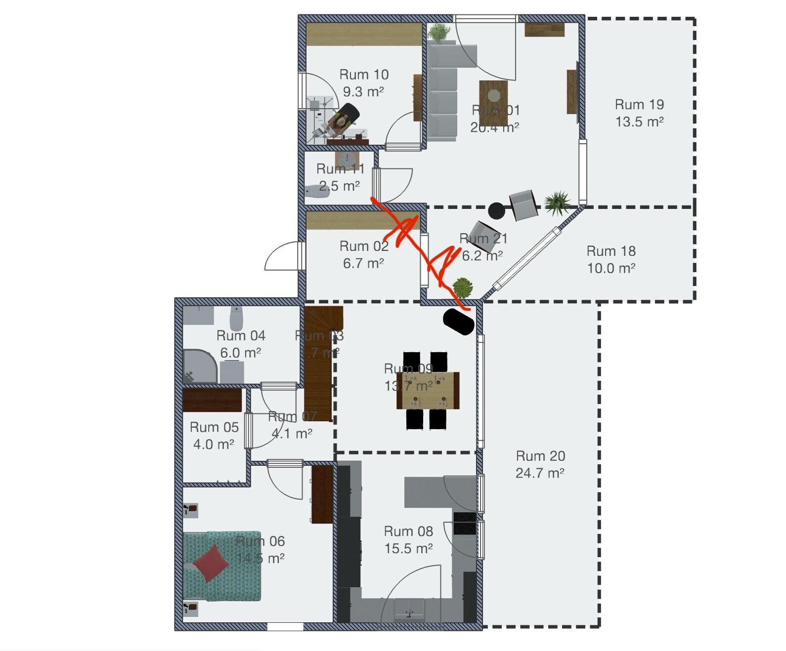 Vi har sedan dess ritat mängder av olika planlösningar och varianter på hur det ska se ut. Nu tror vi eventuellt att vi hittat rätt. Istället för att ha två rektangulära kroppar som är sammanbunden med en hall blir det stället en snedvägg. Då är det inga problem att få plats med toaletten på ett bra sätt och vi tycker att man kommer bort från känslan att man går in i en vägg.