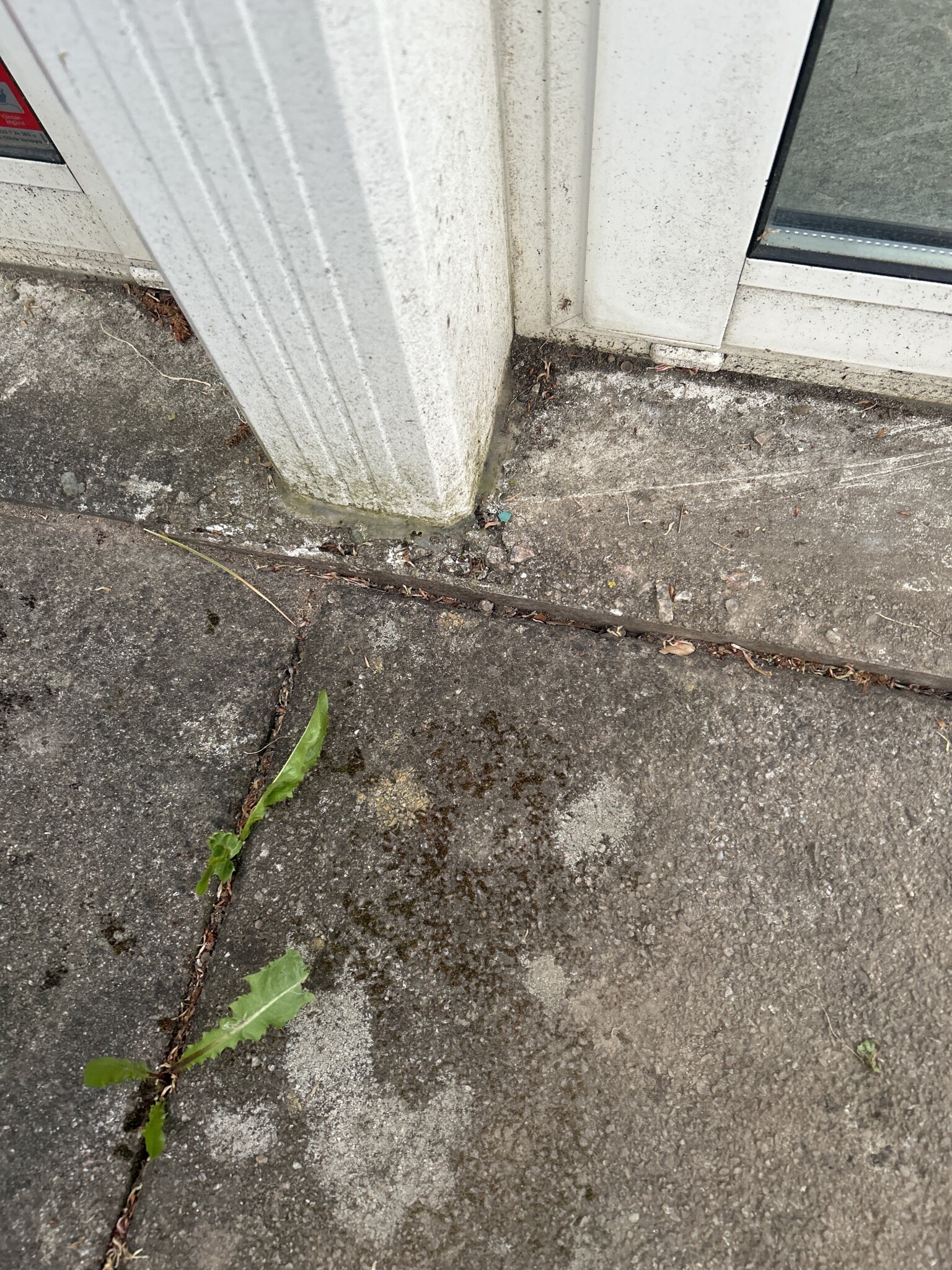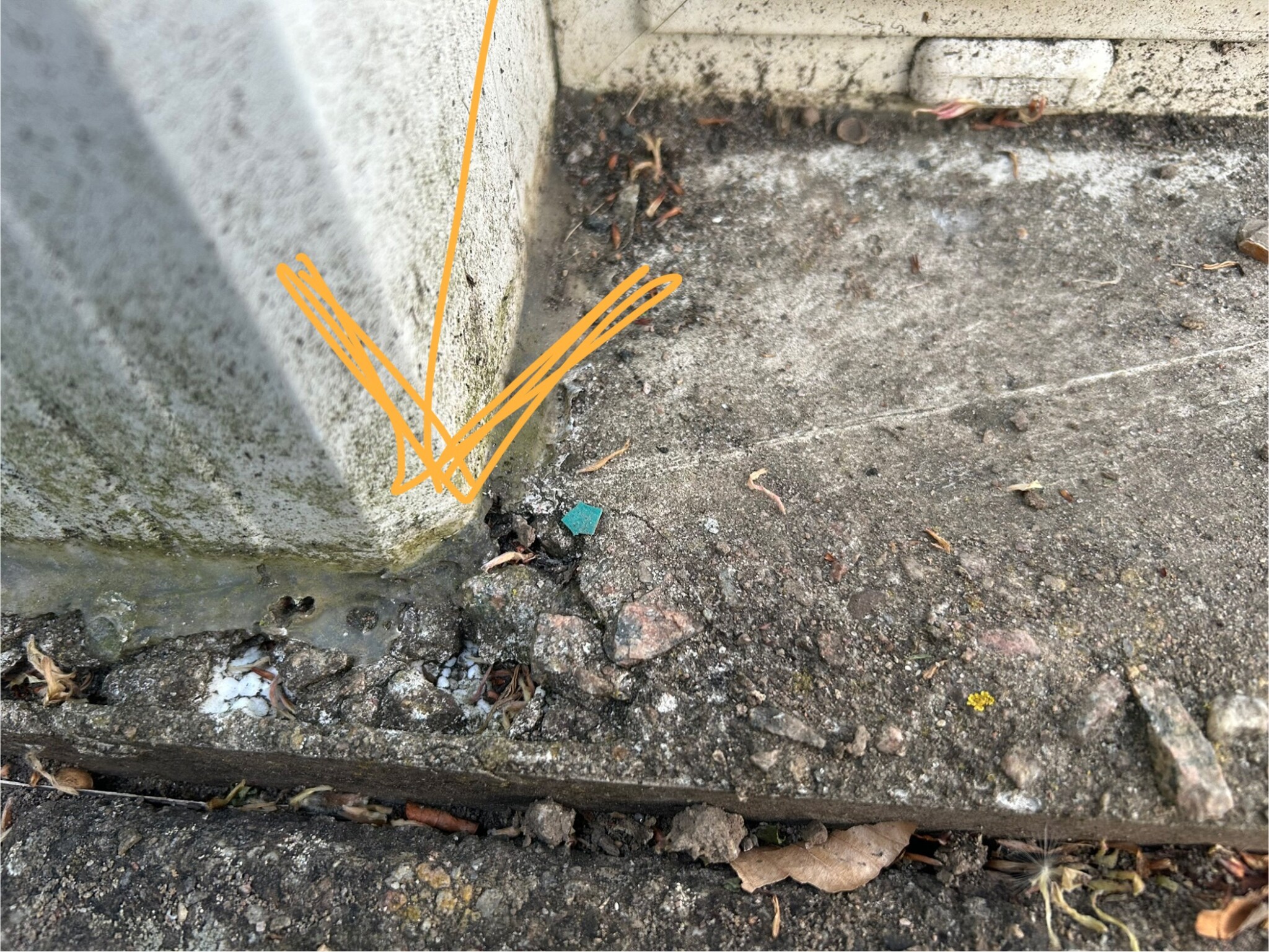 Så att laga med lite cement är nog inte fel, tyvärr verkar det vara silikon mot stolpen där, det måste man kanske ta bort (ordentligt). Silikon är oftast inte så bra mot andra material (andra material fäster inte).