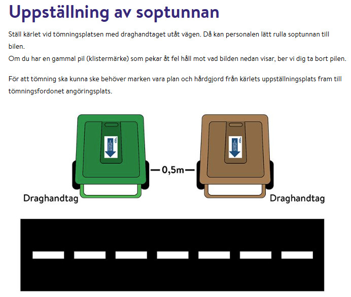 På hämtdagen ska kärlet stå placerat med draghandtaget mot vägen, så att chauffören kan greppa handtaget utan att först behöva lyfta eller vrida sopkärlet. - Dragavstånd