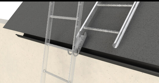 Ah, ok, ja, skorstenen är ju inte hög över taket, kanske en meter, typ... Jag har dock lite lurigt med uppgången som inte kan komma rakt mot skorstenen och vad det verkar måste det ändå vara gångbrygga för att kunna flytta i sidled, samt att bärläktsteg inte är godkända för att fästa säkerhetslina (om han nu skulle kräva det också)...