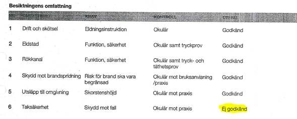 Enligt sotaren är vår nyligen installerad vedkamin godkänd men kommunen säger: själva protokollet är godkänt men det som är gulmarkerat gällande taksäkerhet behöver ni åtgärda innan ni får ett slutbesked av bygglovenheten.